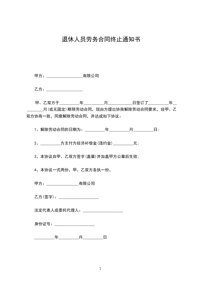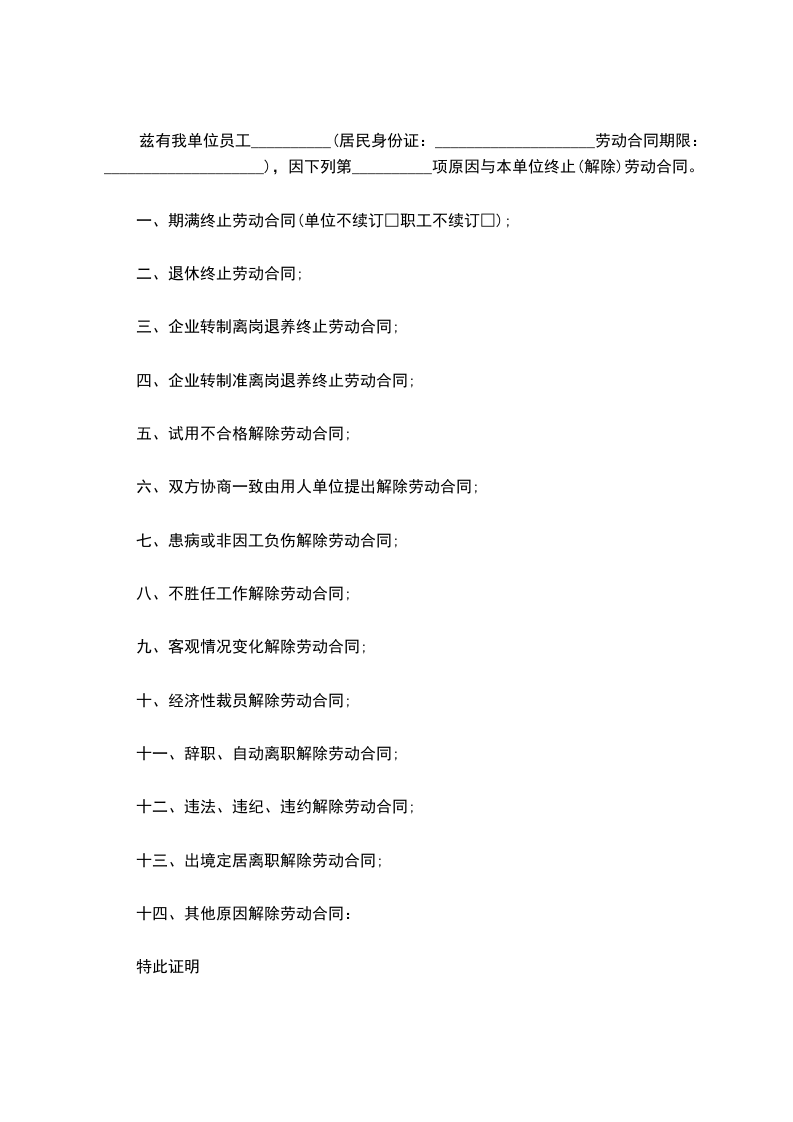 兹有我单位员工__________(居民身份证:____________________劳动合同期限:____________________),因下列第__________项原因与本单位终止(解除)劳动合同。