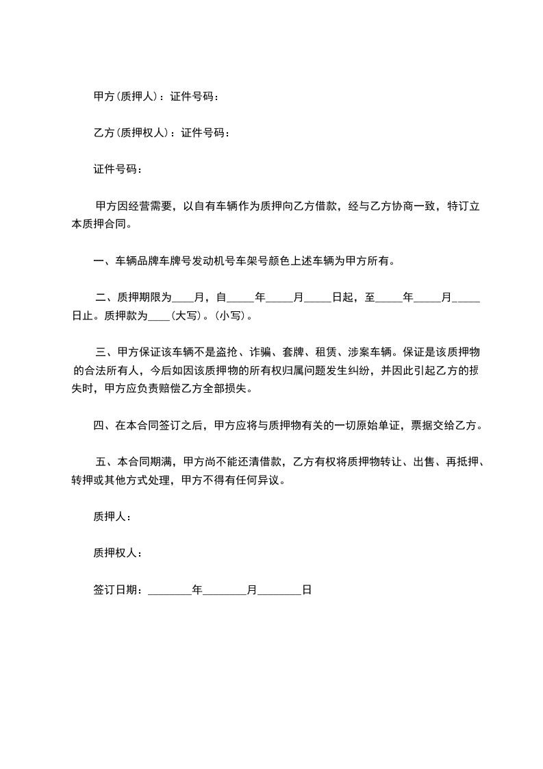 甲方因经营需要,以自有车辆作为质押向乙方借款,经与乙方协商一致,特订立本质押合同。