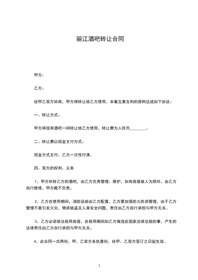 甲方将现有酒吧一间转让给乙方使用,转让费为人民币________。