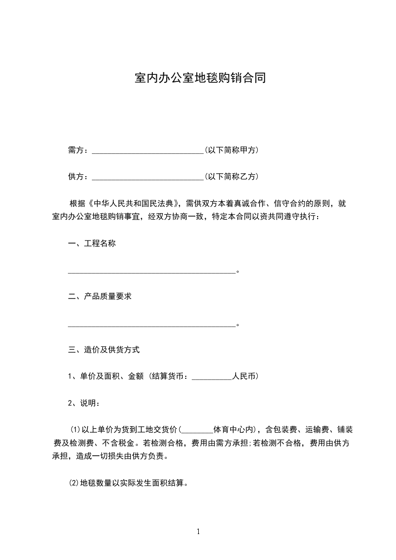 根据《中华人民共和国民法典》,需供双方本着真诚合作、信守合约的原则,就室内办公室地毯购销事宜,经双方协商一致,特定本合同以资共同遵守执行: