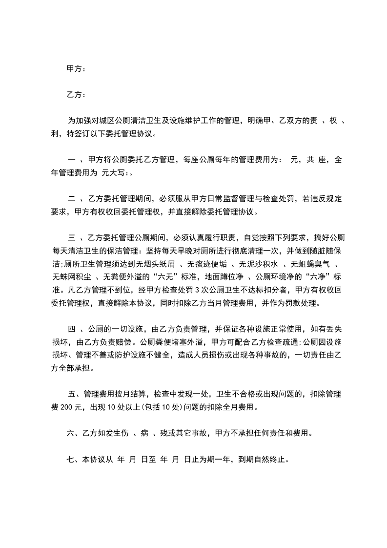 为加强对城区公厕清洁卫生及设施维护工作的管理,明确甲、乙双方的责 、权 、利,特签订以下委托管理协议。