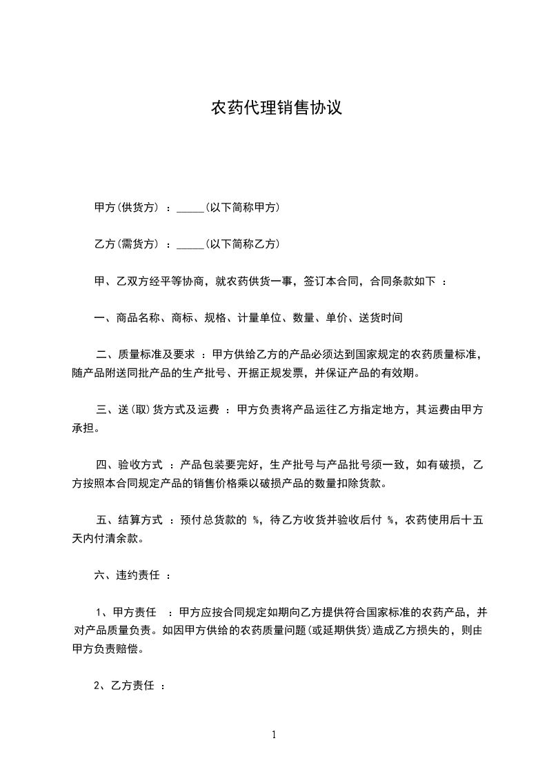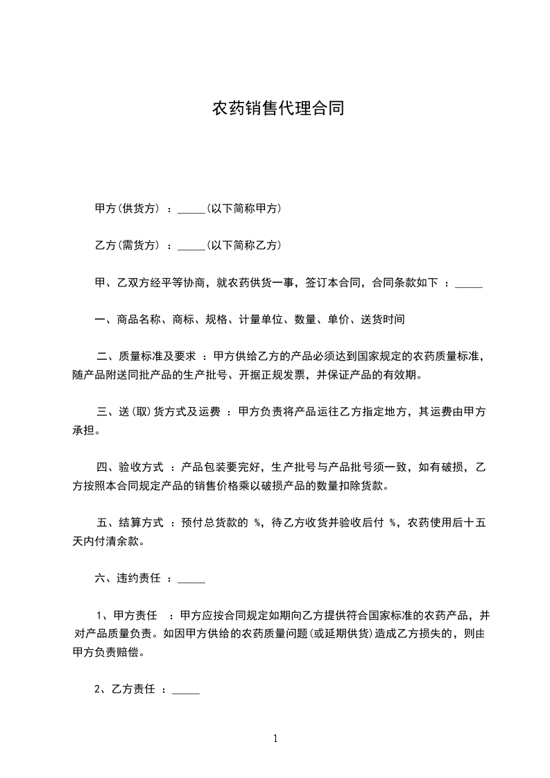1、甲方责任:甲方应按合同规定如期向乙方提供符合国家标准的农药产品,并对产品质量负责。如因甲方供给的农药质量问题(或延期供货)造成乙方损失的,则由甲方负责赔偿。