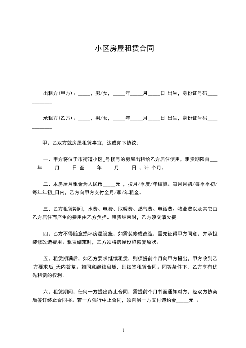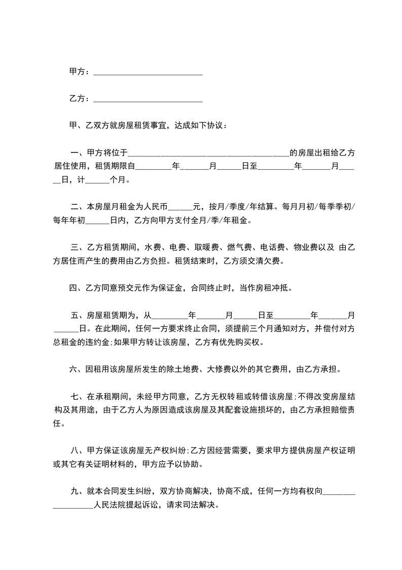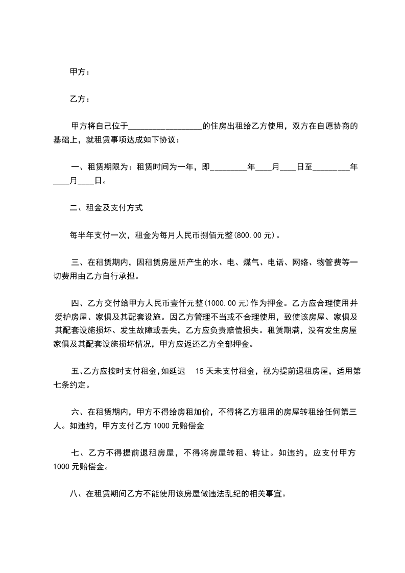 七、乙方不得提前退租房屋,不得将房屋转租、转让。如违约,应支付甲方1000元赔偿金。