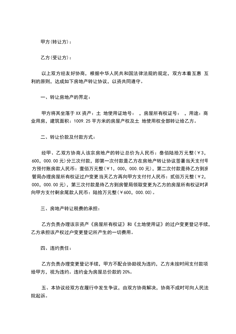甲方将其坐落于XX资产:土 地使用证地号: ,房屋所有权证号: ,用途:商业用房,建筑面积:1009.25平方米的房屋产权及土 地使用权全部转让给乙方。
