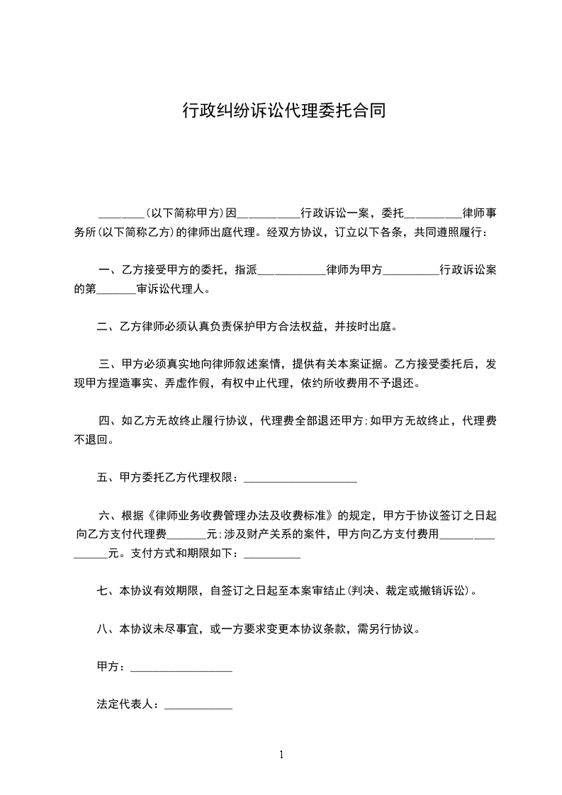 ________(以下简称甲方)因___________行政诉讼一案,委托__________律师事务所(以下简称乙方)的律师出庭代理。经双方协议,订立以下各条,共同遵照履行: