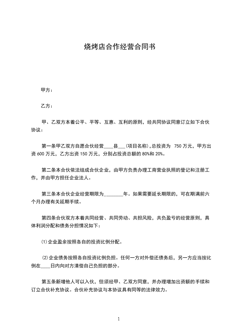 第一条甲乙双方自愿合伙经营____县___(项目名称),总投资为750万元,甲方出资600万元,乙方出资150万元,分别占投资总额的80%和20%。