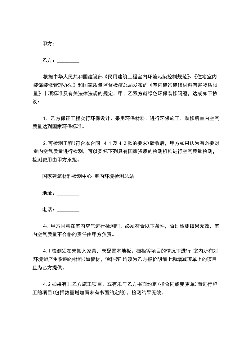 根据中华人民共和国建设部《民用建筑工程室内环境污染控制规范》、《住宅室内装饰装修管理办法》和国家质量监督检疫总局发布的《室内装饰装修材料有害物质限量》十项标准及有关法律法规的规定,甲、乙双方就绿色环保装修问题,达成如下协议: