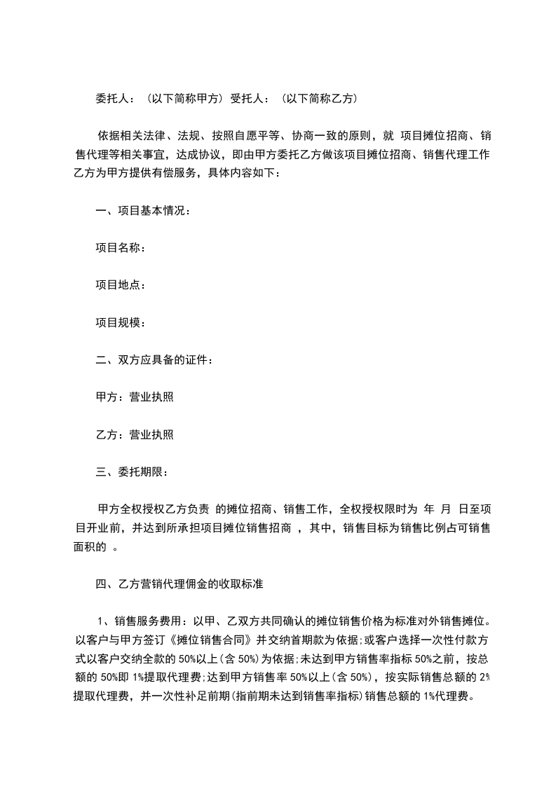 依据相关法律、法规、按照自愿平等、协商一致的原则,就 项目摊位招商、销售代理等相关事宜,达成协议,即由甲方委托乙方做该项目摊位招商、销售代理工作,乙方为甲方提供有偿服务,具体内容如下: