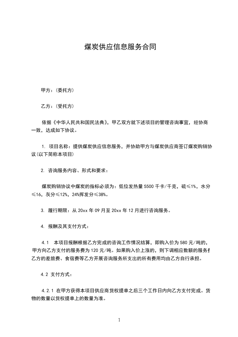 1. 项目名称:提供煤炭供应信息服务,并协助甲方与煤炭供应商签订煤炭购销协议(以下简称本项目)