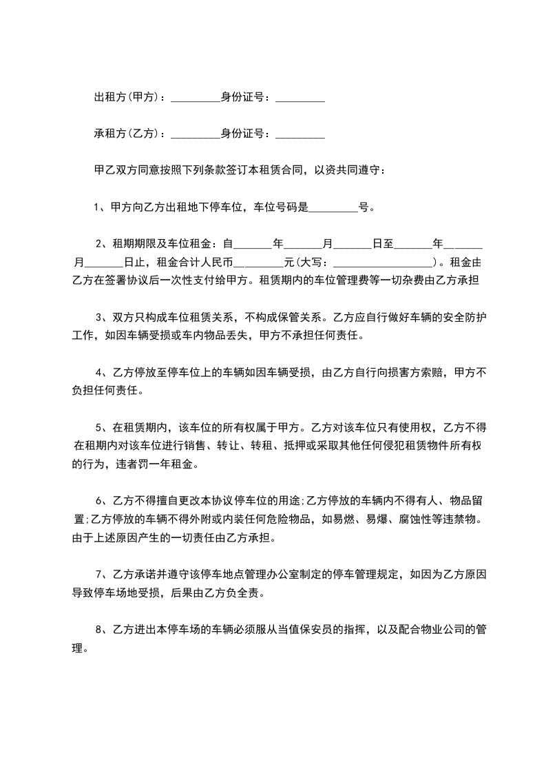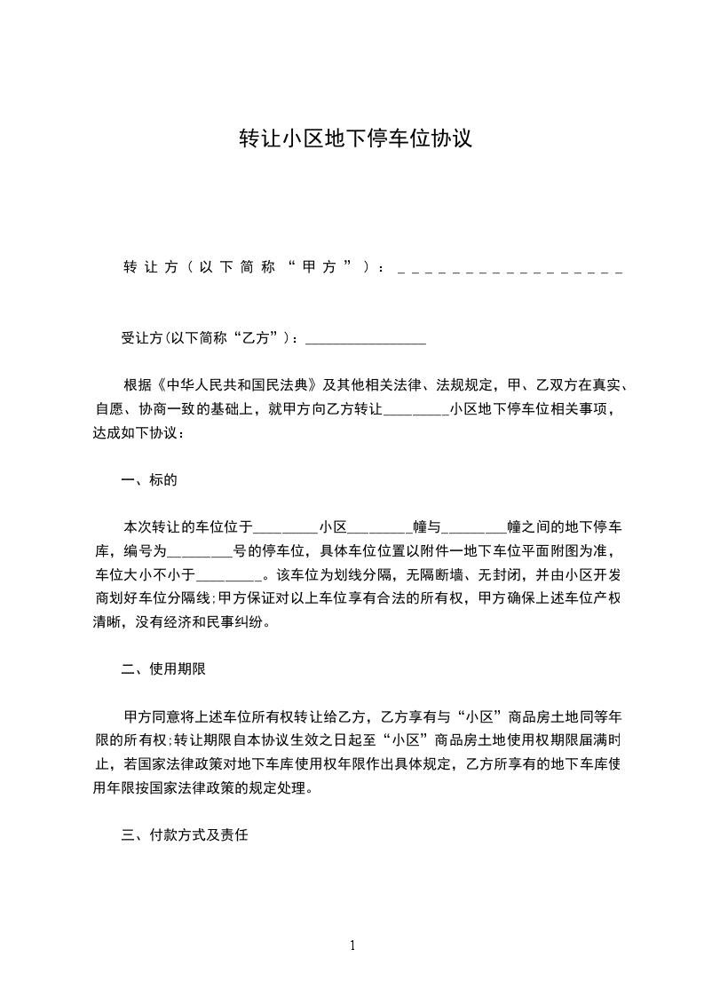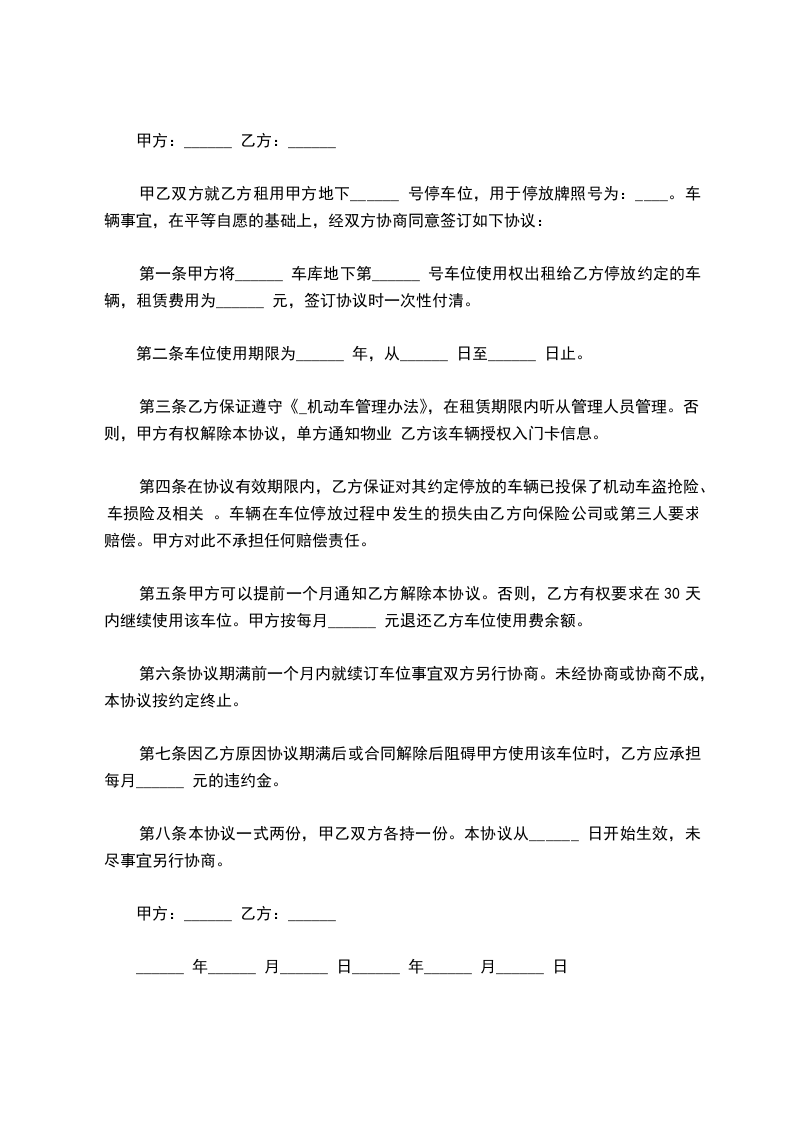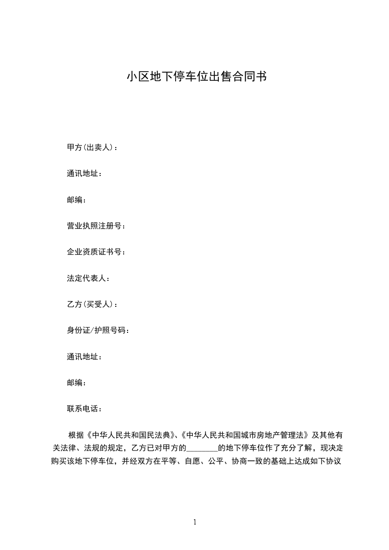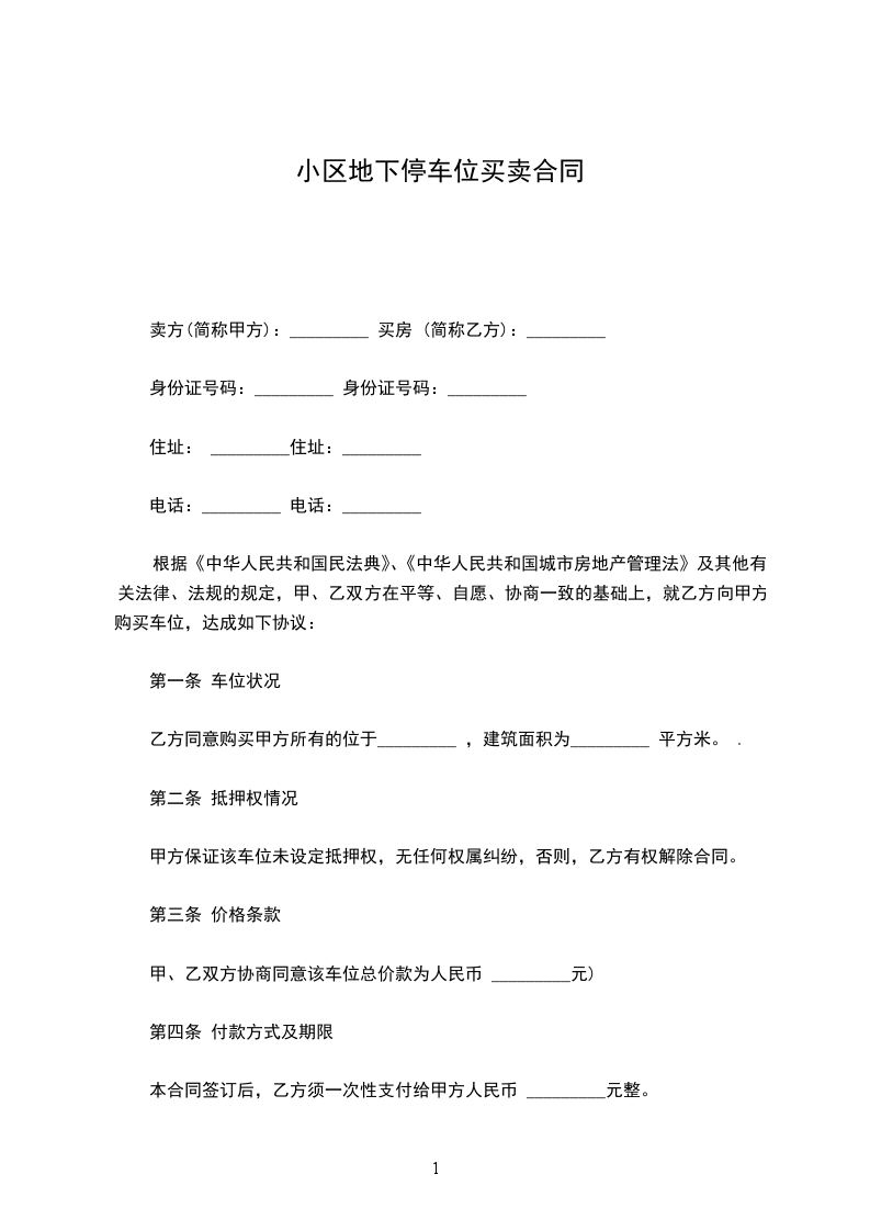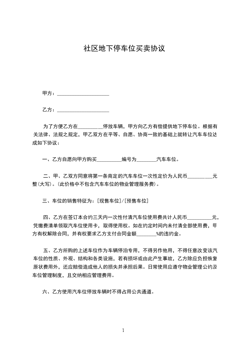根据《中华人民共和国民法典》、《中华人民共和国城市房地产管理法》及其他有关法律、法规的规定,乙方已对甲方的________的地下停车位作了充分了解,现决定购买该地下停车位,并经双方在平等、自愿、公平、协商一致的基础上达成如下协议: