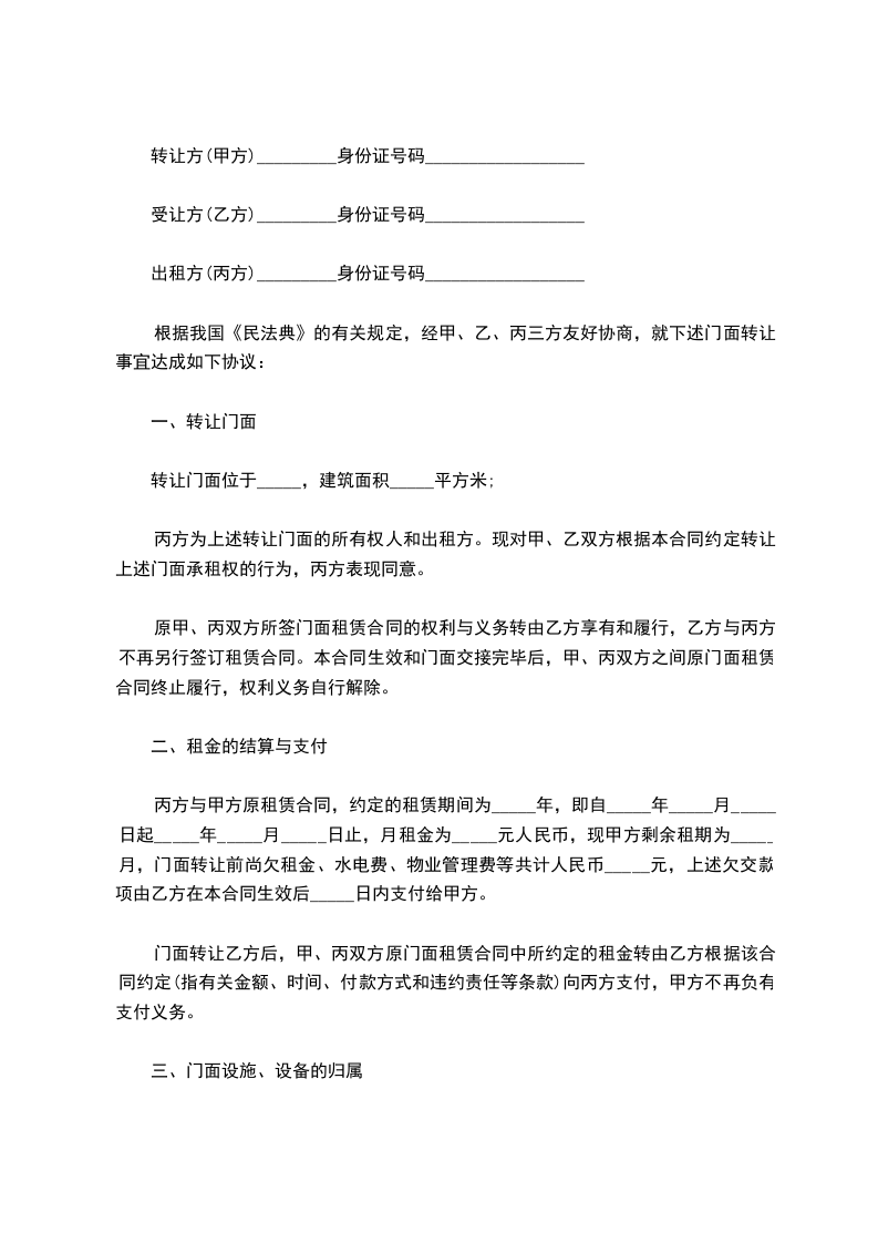 根据我国《民法典》的有关规定,经甲、乙、丙三方友好协商,就下述门面转让事宜达成如下协议: