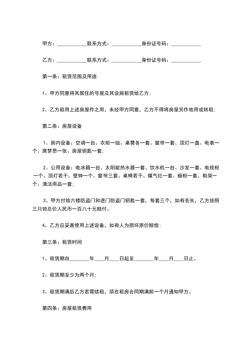 1、甲方同意将其居住的号屋及其设施租赁给乙方;