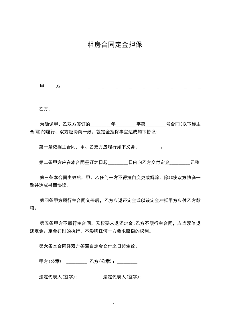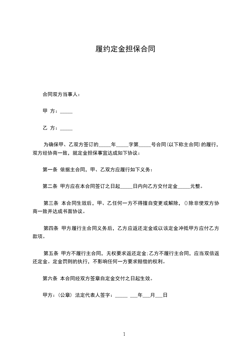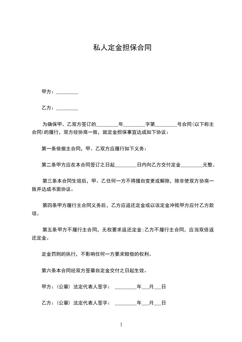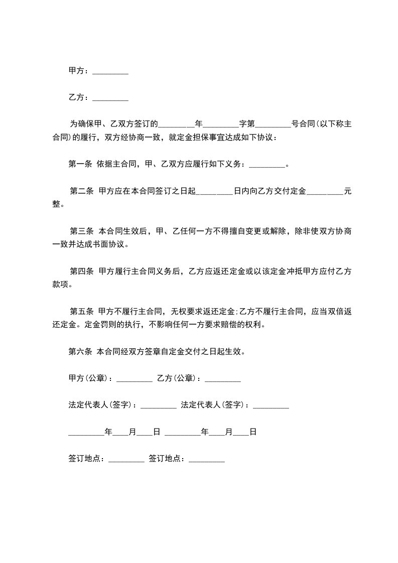 为确保甲、乙双方签订的_________年_________字第_________号合同的履行,双方经协商一致,就定金担保事宜达成如下协议:
