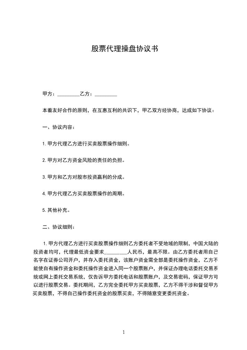 1.甲方代理乙方进行买卖股票操作细则乙方委托者不受地域的限制,中国大陆的投资者均可,代理最低资金要求_________人民币,最高不限。由乙方委托者用自己名字在证券公司开户,并存入委托资金,该账户资金需全部是委托操作资金,乙方不能使自有操作资金和委托操作资金进入同一个股票账户,并保证办理电话委托交易系统或网上委托交易系统,仅告诉甲方委托电话和股票账户,及交易密码,保证甲方可以进行股票交易。委托期间,乙方完全委托甲方买卖股票,乙方不得干涉和督促甲方买卖股票,不得自己操作委托资金的股票买卖,不得随意变更委托资金。