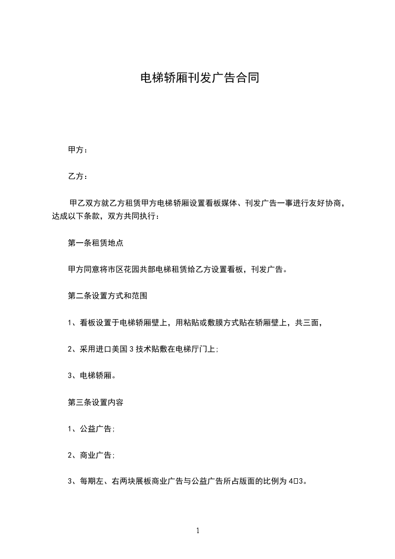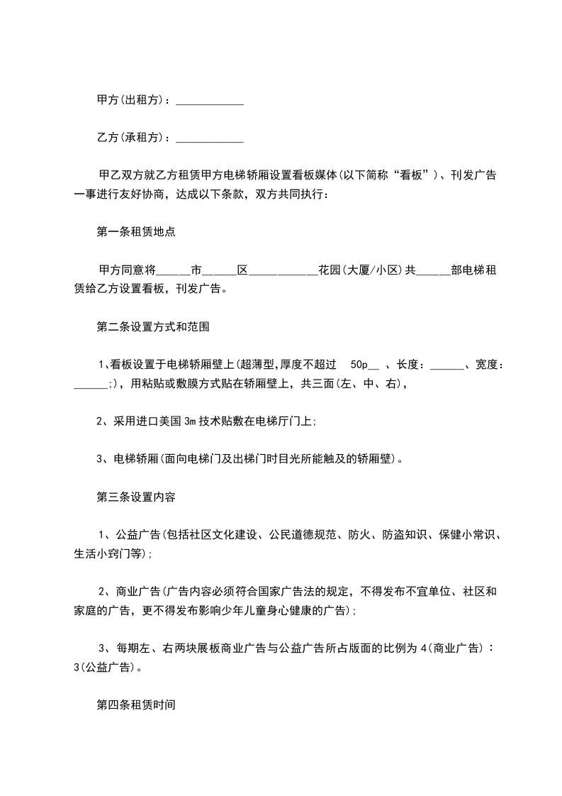 甲方同意将市区花园共部电梯租赁给乙方设置看板,刊发广告。