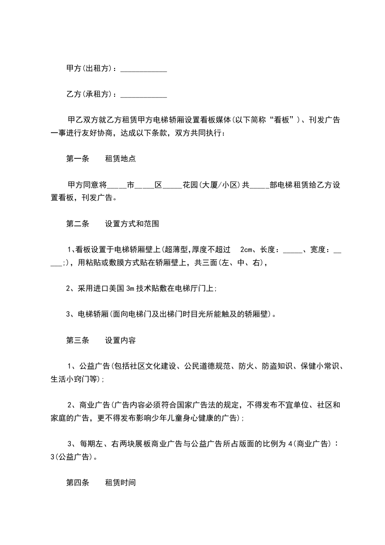 甲乙双方就乙方租赁甲方电梯轿厢设置看板媒体、刊发广告一事进行友好协商,达成以下条款,双方共同执行: