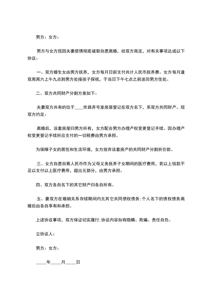 男方与女方现因夫妻感情彻底破裂自愿离婚,经双方商定,对有关事项达成以下协议:
