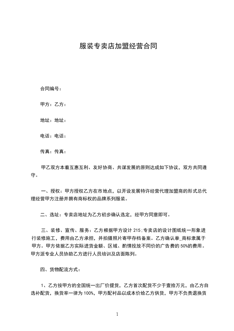 一、授权:甲方授权乙方在市地点,以开设发展特许经营代理加盟商的形式总代理经营甲方注册并拥有商标权的品牌系列服装。