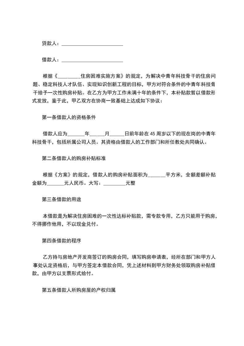 根据《_________住房困难实施方案》的规定,为解决中青年科技骨干的住房问题、稳定科技人才队伍、实现知识创新工程的目标,甲方对符合条件的中青年科技骨干给予一次性购房补贴。在乙方为甲方工作未满十年的条件下,本补贴款暂以借款形式发放,鉴于此,甲乙双方在协商一致基础上达成如下协议: