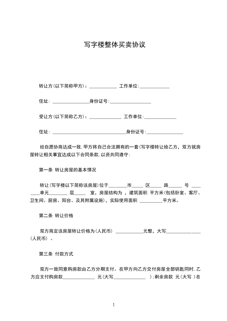 经自愿协商达成一致,甲方将自己合法拥有的一套(写字楼转让给乙方,双方就房屋转让相关事宜达成以下合同条款,以资共同遵守: