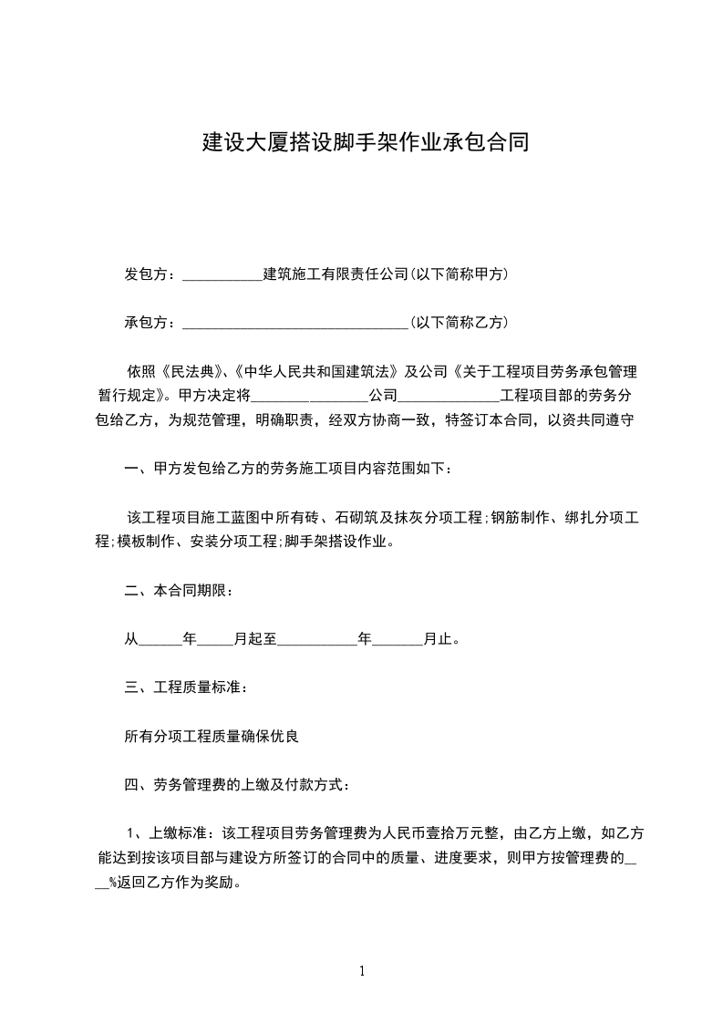 依照《民法典》、《中华人民共和国建筑法》及公司《关于工程项目劳务承包管理暂行规定》。甲方决定将________________公司______________工程项目部的劳务分包给乙方,为规范管理,明确职责,经双方协商一致,特签订本合同,以资共同遵守。