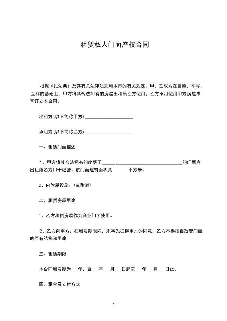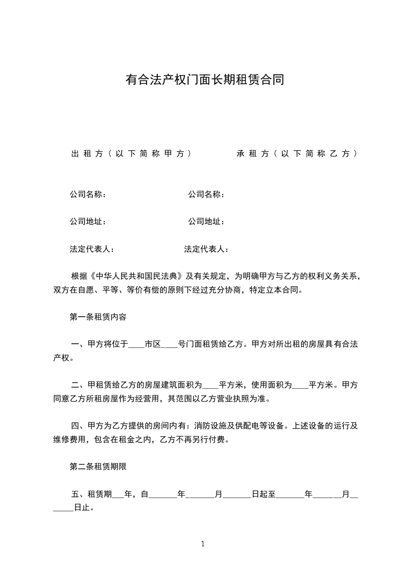 一、甲方将位于____________门面租赁给乙方。甲方对所出租的房屋具有合法产权。