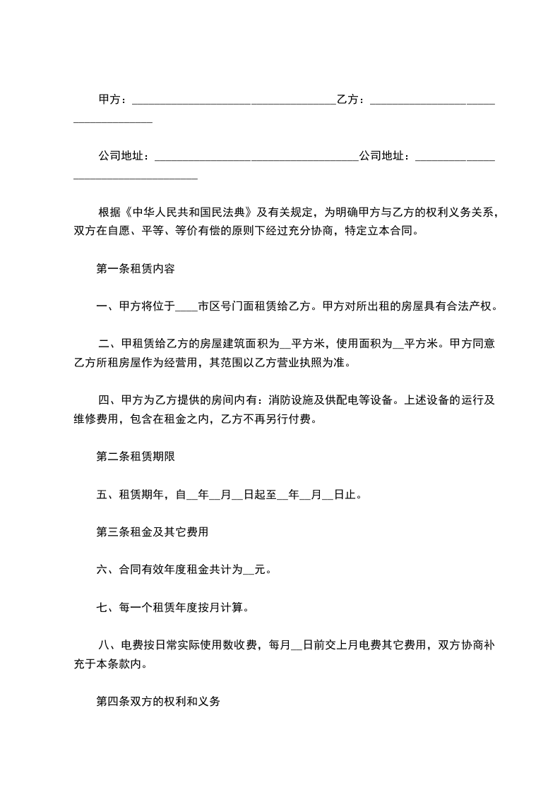 二、甲租赁给乙方的房屋建筑面积为_______平方米,使用面积为_______平方米。甲方同意乙方所租房屋作为经营用,其范围以乙方营业执照为准。