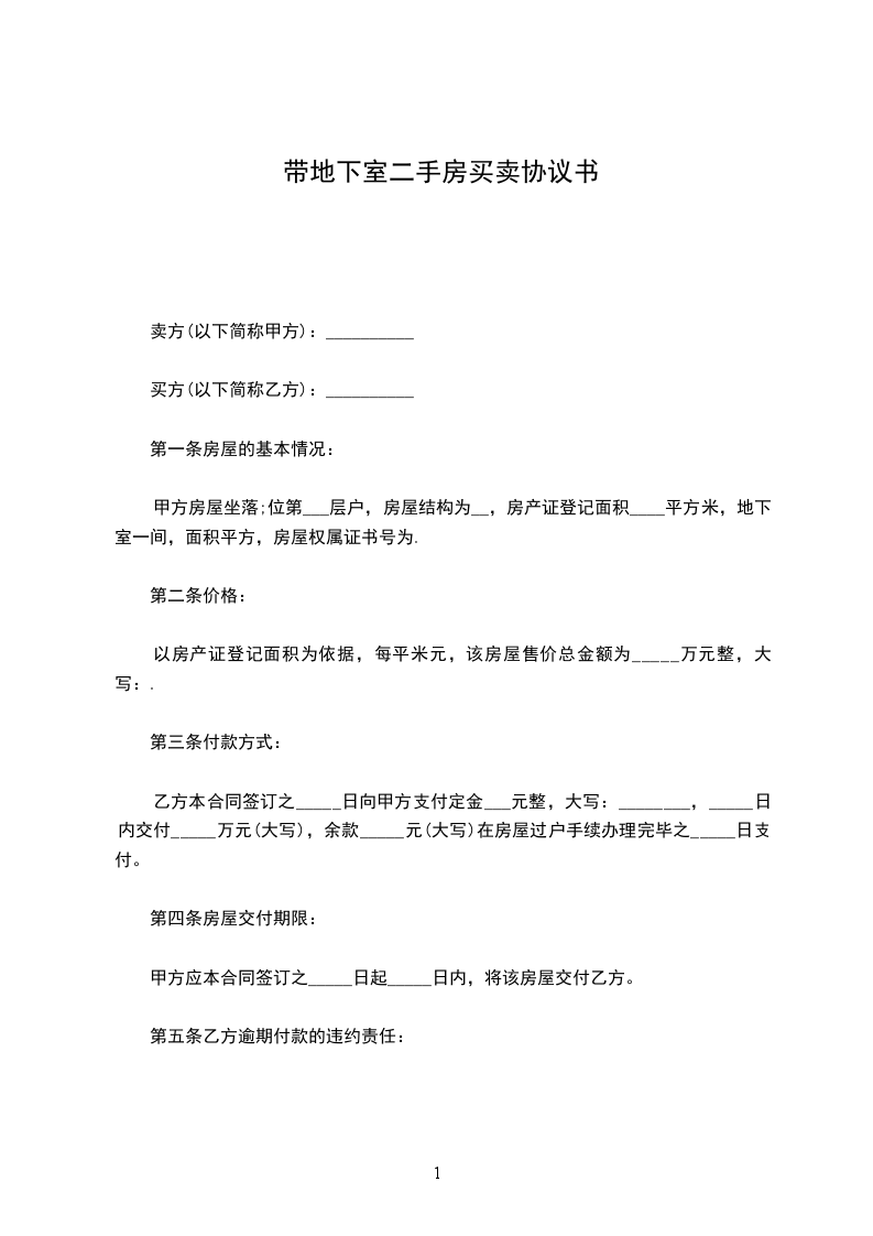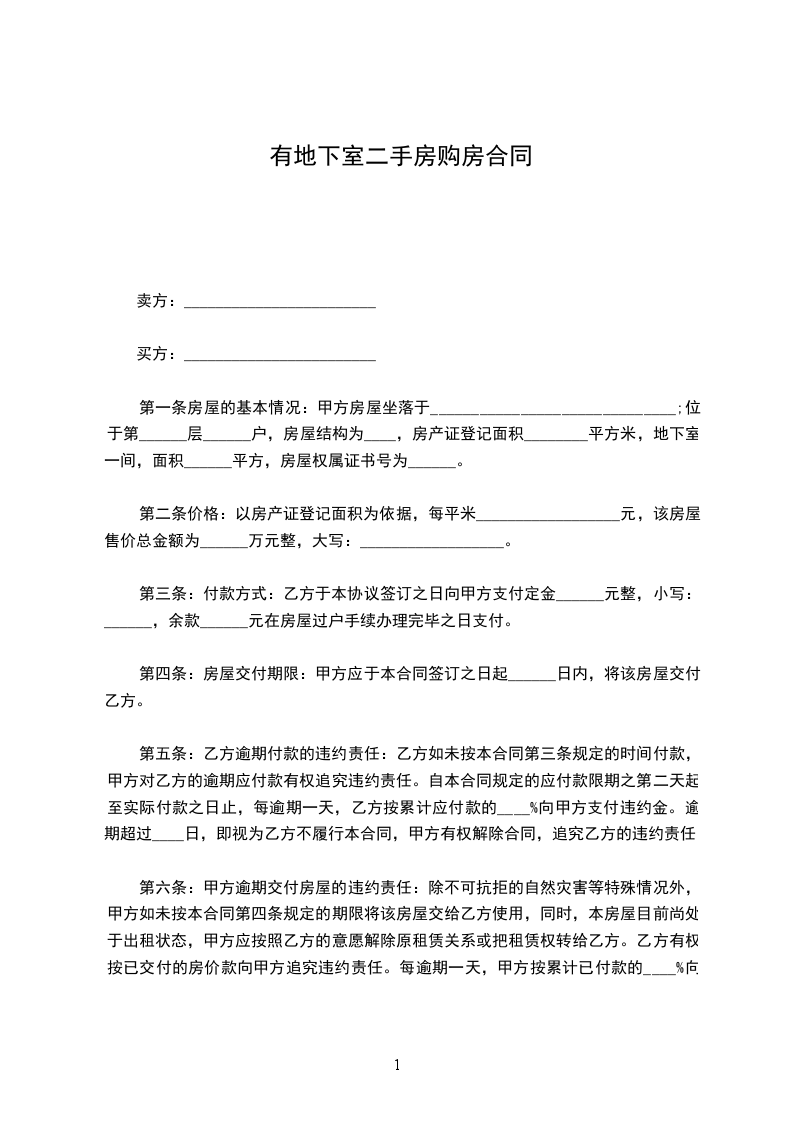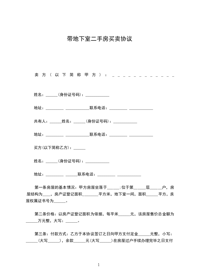 第一条房屋的基本情况:甲方房屋坐落于______________________________;位于第______层______户,房屋结构为____,房产证登记面积________平方米,地下室一间,面积______平方,房屋权属证书号为______。