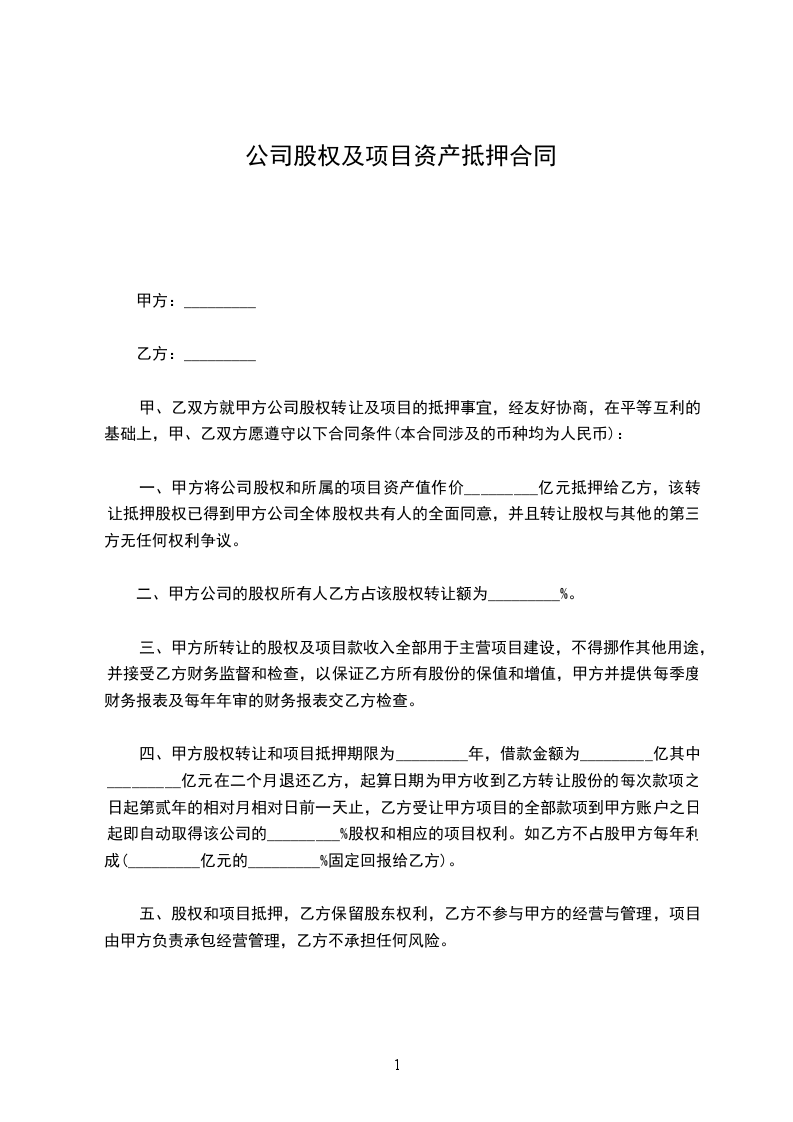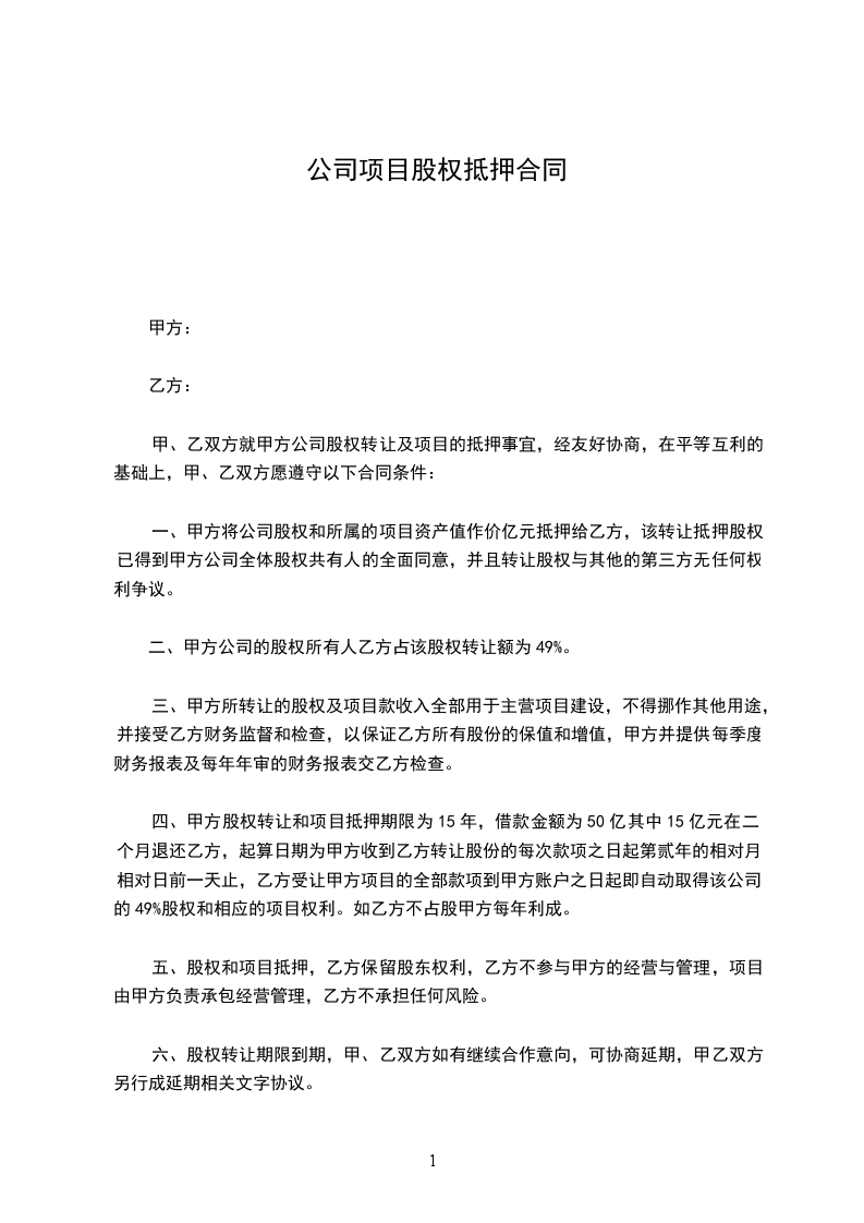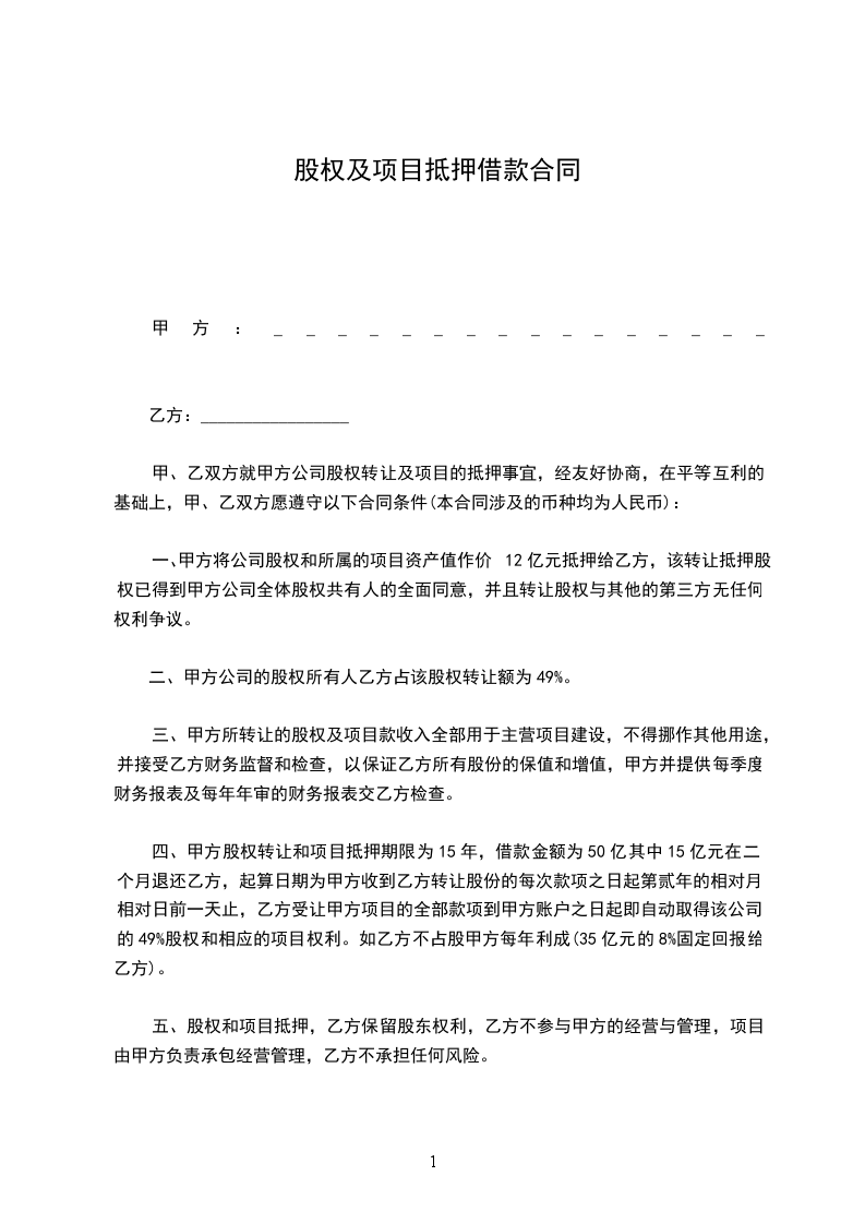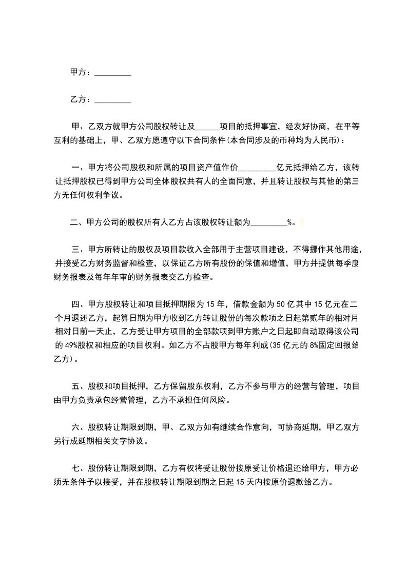 一、甲方将公司股权和所属的项目资产值作价亿元抵押给乙方,该转让抵押股权已得到甲方公司全体股权共有人的全面同意,并且转让股权与其他的第三方无任何权利争议。