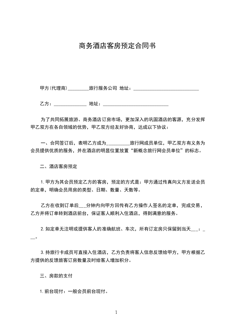 1、甲方为其会员预定乙方的客房,预定的方式是:甲方通过传真向义方发送会员的定单,明确会员用房的类型、日期、数量、天数等。乙方在收到订单后___分钟内向甲方回传有乙方操作人签名的定单,完成交易,乙方并将订单转到酒店前台,保证客人顺利入住酒店,得到满意的服务。