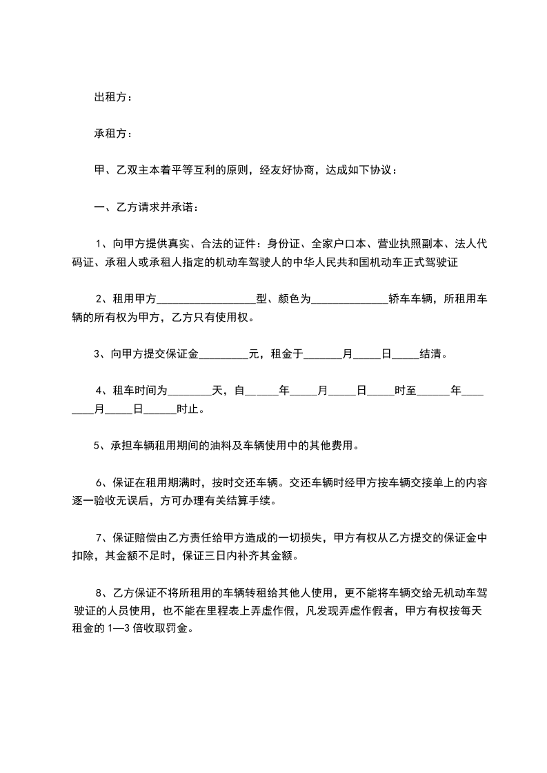 8、乙方保证不将所租用的车辆转租给其他人使用,更不能将车辆交给无机动车驾驶证的人员使用,也不能在里程表上弄虚作假,凡发现弄虚作假者,甲方有权按每天租金的1—3倍收取罚金。