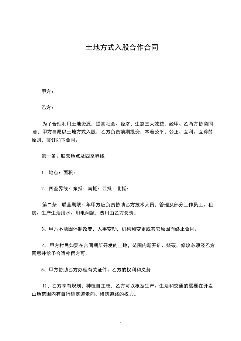为了合理利用土地资源,提高社会、经济、生态三大效益,经甲、乙两方协商同意,甲方自愿以土地方式入股,乙方负责前期投资,本着公平、公正、互利、互尊的原则,签订如下合同。