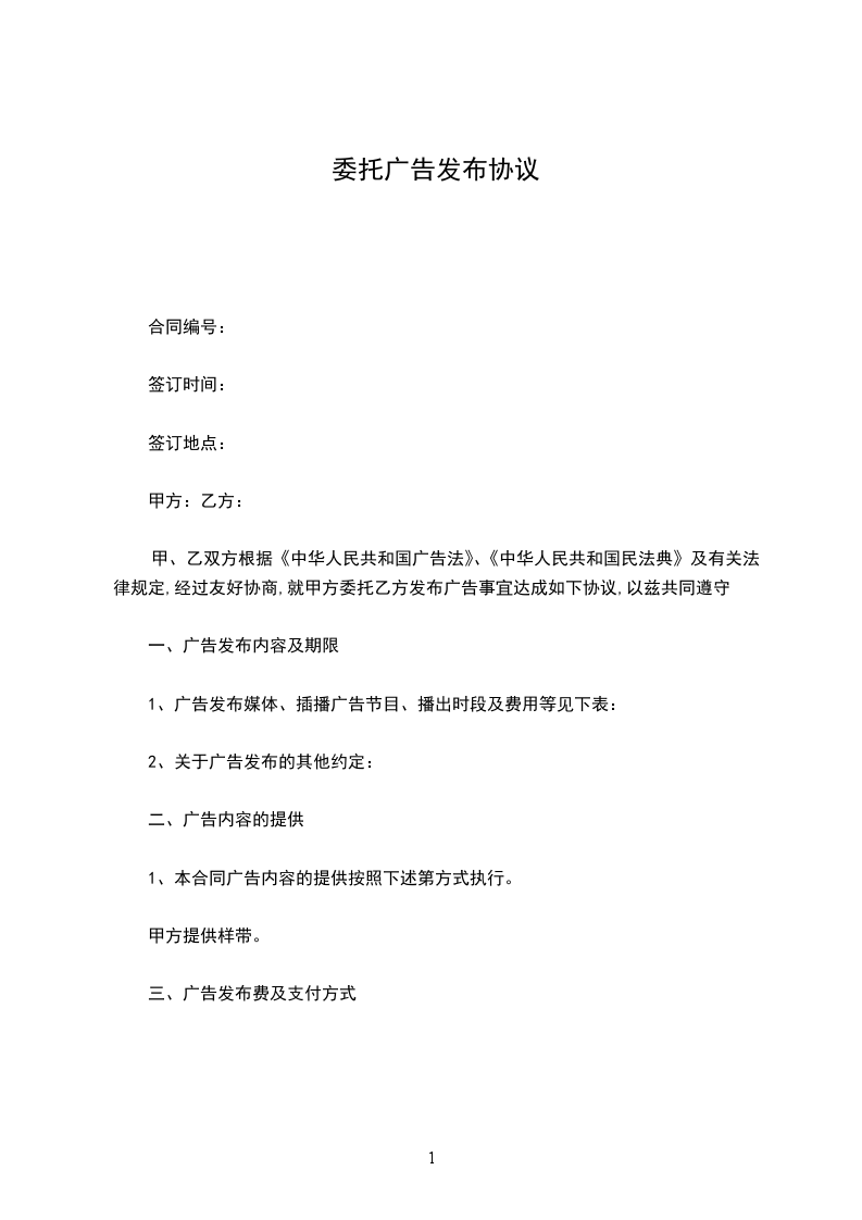 甲、乙双方根据《中华人民共和国广告法》、《中华人民共和国民法典》及有关法律规定,经过友好协商,就甲方委托乙方发布广告事宜达成如下协议,以兹共同遵守