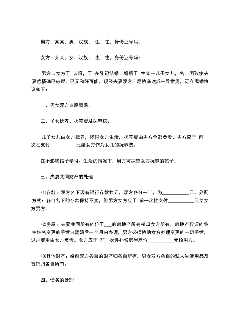 男方与女方于 认识,于 在登记结婚,婚后于 生育一儿子女儿,名。因致使夫妻感情确已破裂,已无和好可能,现经夫妻双方自愿协商达成一致意见,订立离婚协议如下: