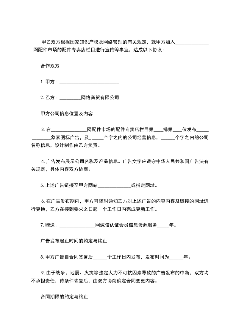 甲乙双方根据国家知识产权及网络管理的有关规定,就甲方加入_______________网配件市场的配件专卖店栏目进行宣传等事宜,达成以下协议: