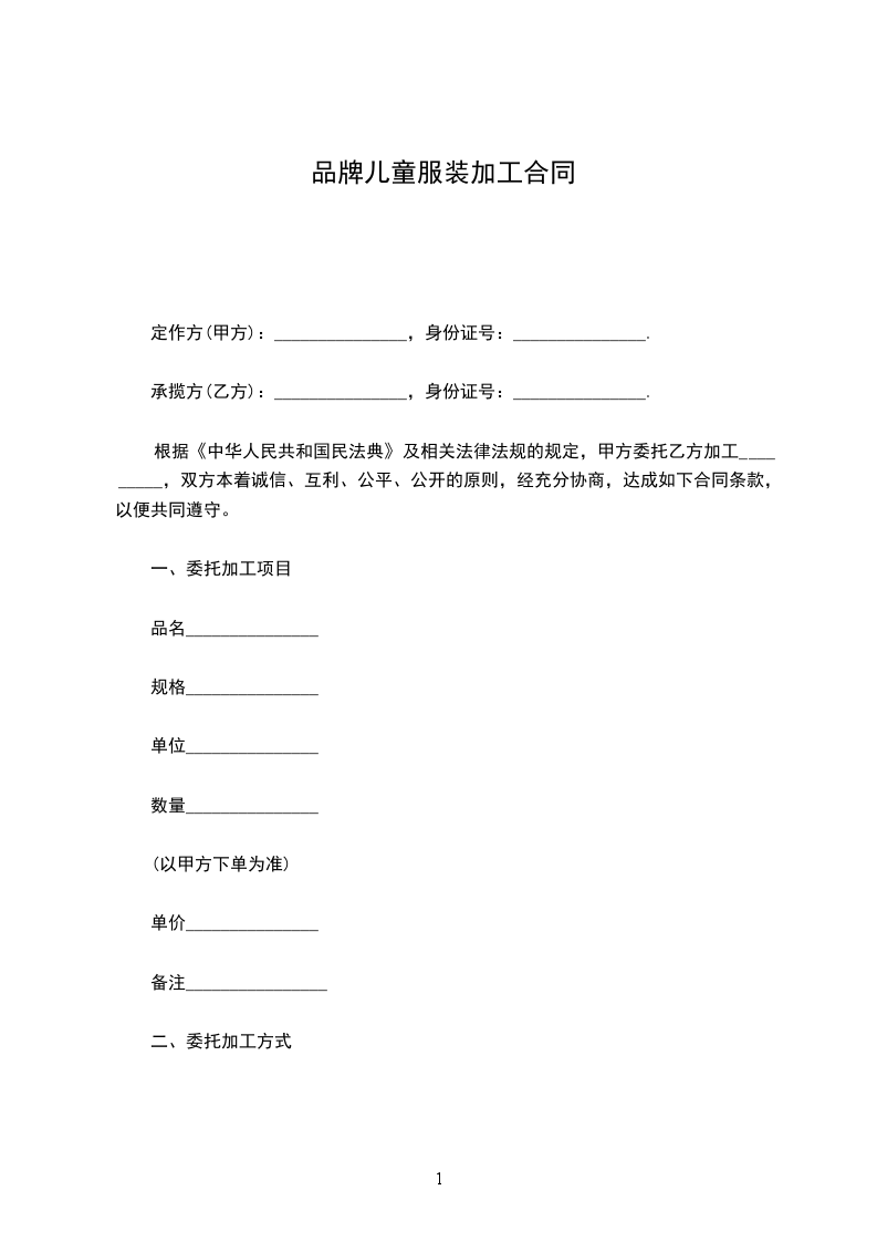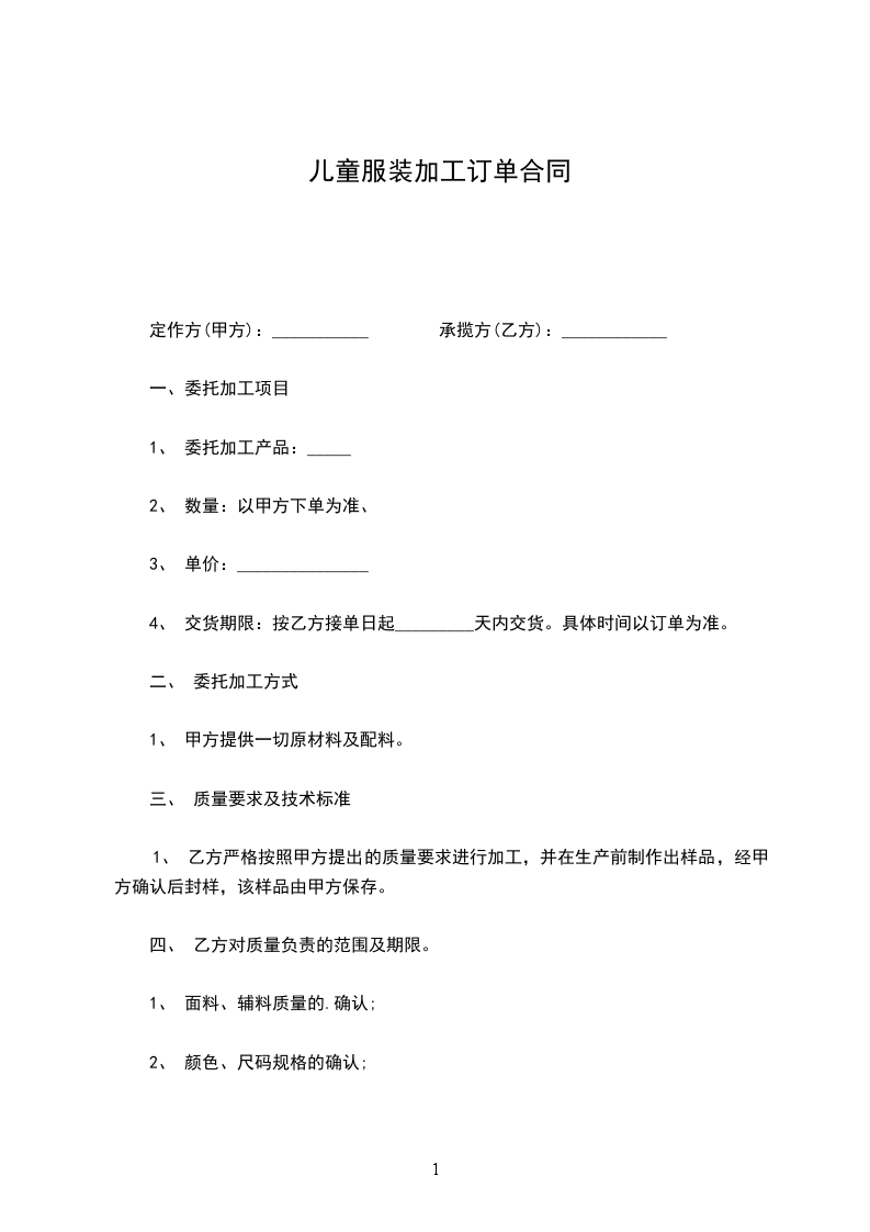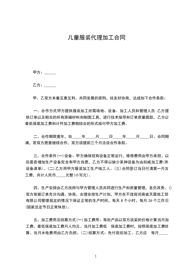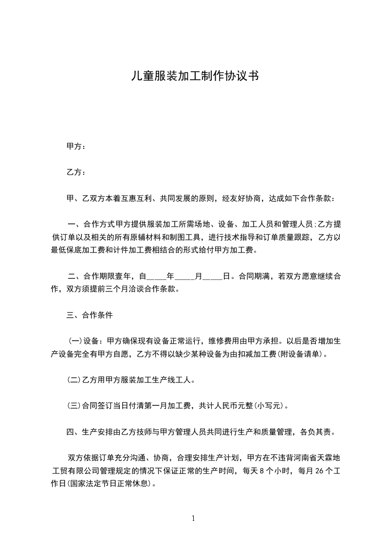 一、合作方式甲方提供服装加工所需场地、设备、加工人员和管理人员;乙方提供订单以及相关的所有原辅材料和制图工具,进行技术指导和订单质量跟踪,乙方以最低保底加工费和计件加工费相结合的形式给付甲方加工费。