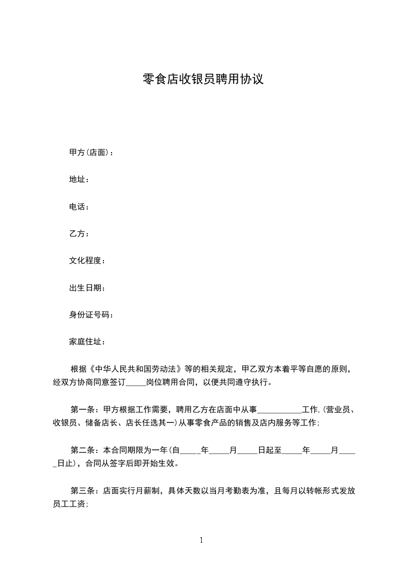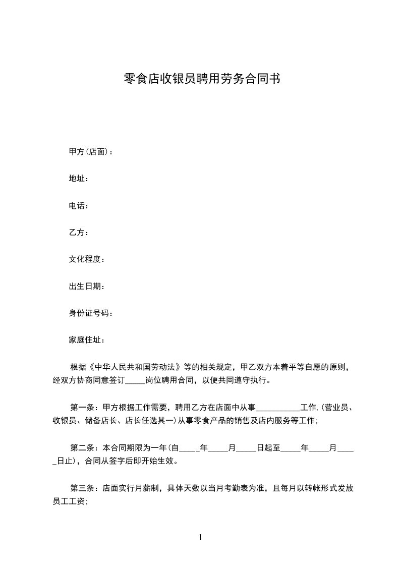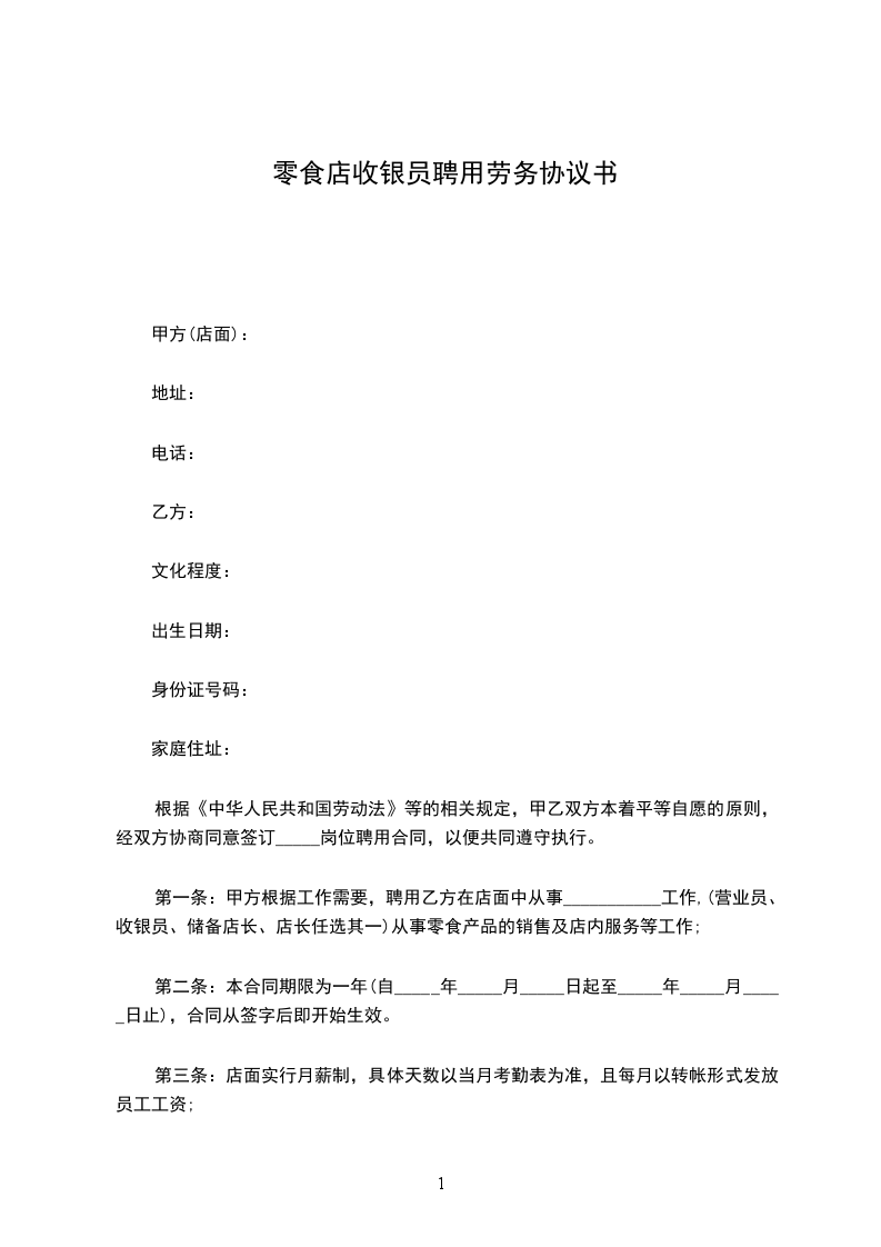 零食店收银员聘用劳务合同