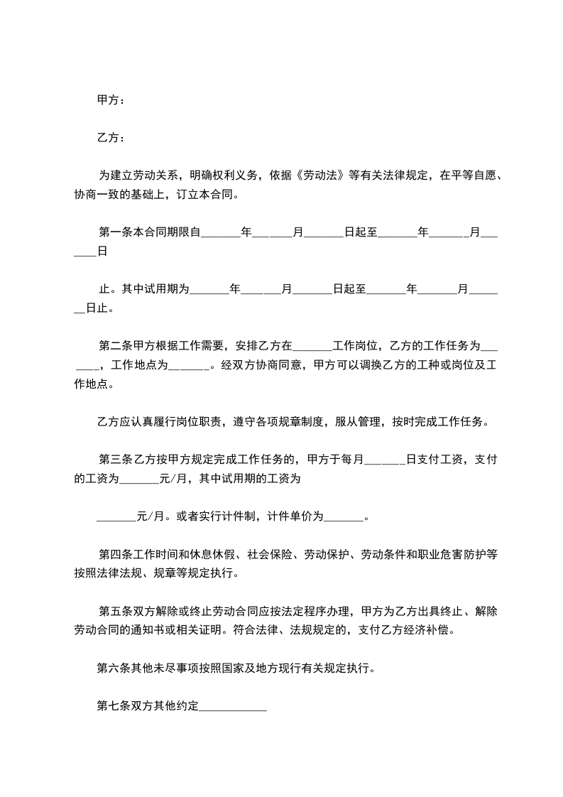 第二条:本合同期限为一年(自_____年_____月_____日起至_____年_____月_____日止),合同从签字后即开始生效。