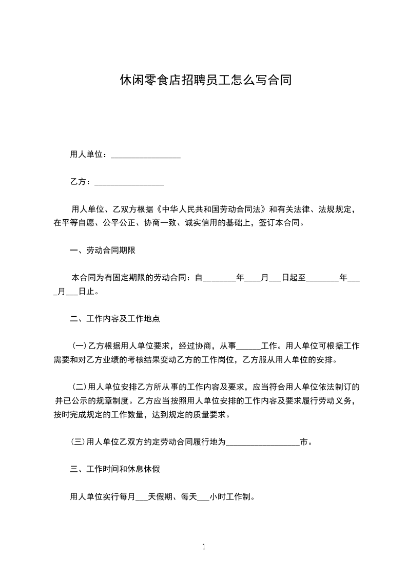 第一条:甲方根据工作需要,聘用乙方在店面中从事___________工作,(营业员、收银员、储备店长、店长任选其一)从事零食产品的销售及店内服务等工作;