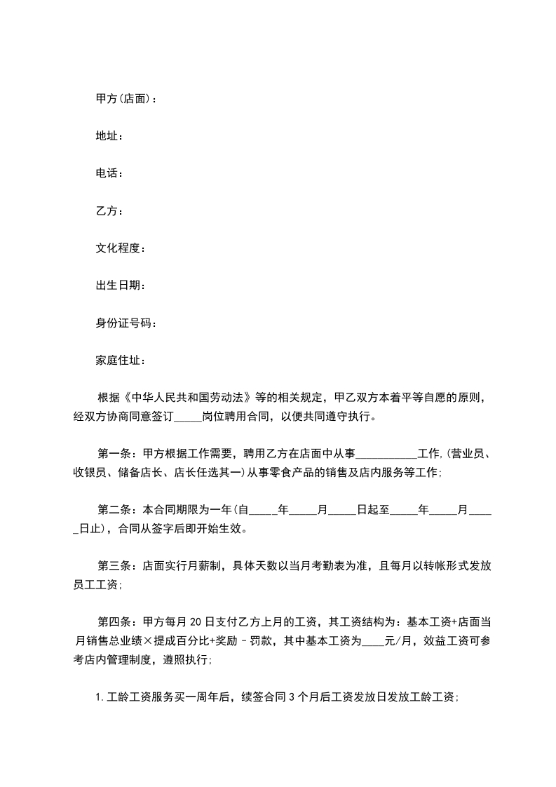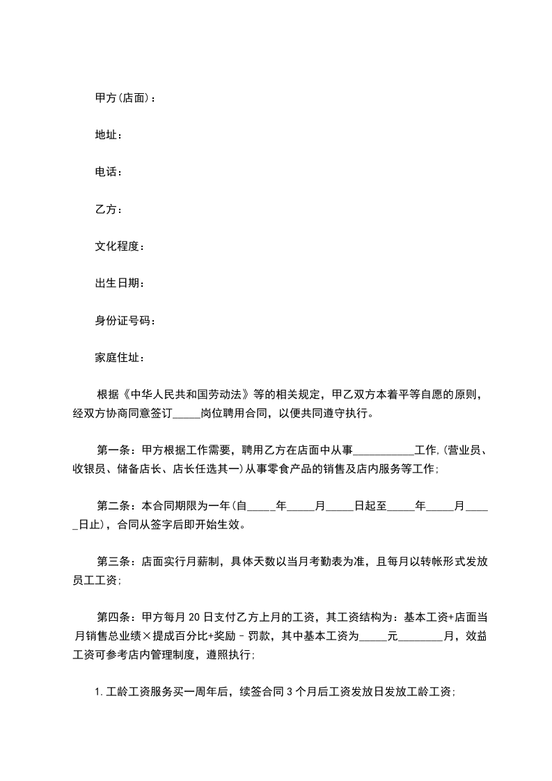 第四条:甲方每月20日支付乙方上月的工资,其工资结构为:基本工资+店面当月销售总业绩×提成百分比+奖励–罚款,其中基本工资为_____元/月,效益工资可参考店内管理制度,遵照执行;