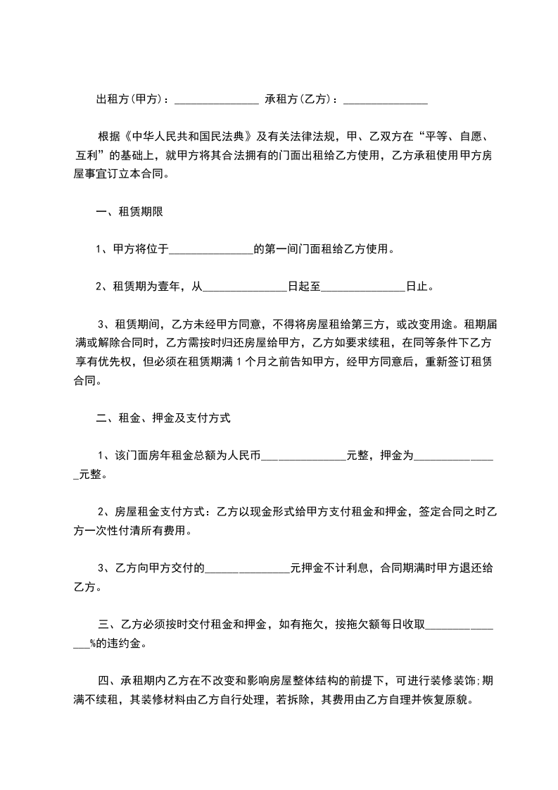 根据《中华人民共和国民法典》及有关法律法规,甲、乙双方在“平等、自愿、互利”的基础上,就甲方将其合法拥有的门面出租给乙方使用,乙方承租使用甲方房屋事宜订立本合同。