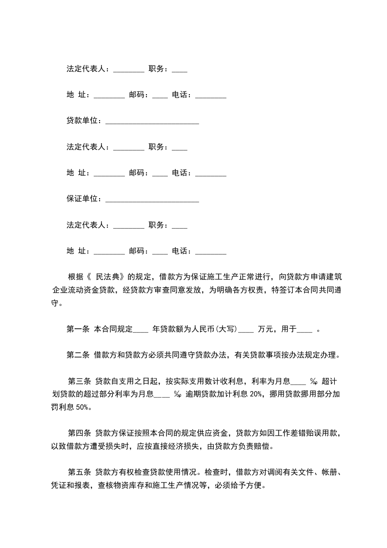 根据《中华人民共和国民法典》的规定,借款方为保证施工生产正常进行,向贷款方申请建筑企业流动资金贷款,经贷款方审查同意发放,为明确各方权责,特签订本合同共同遵守。