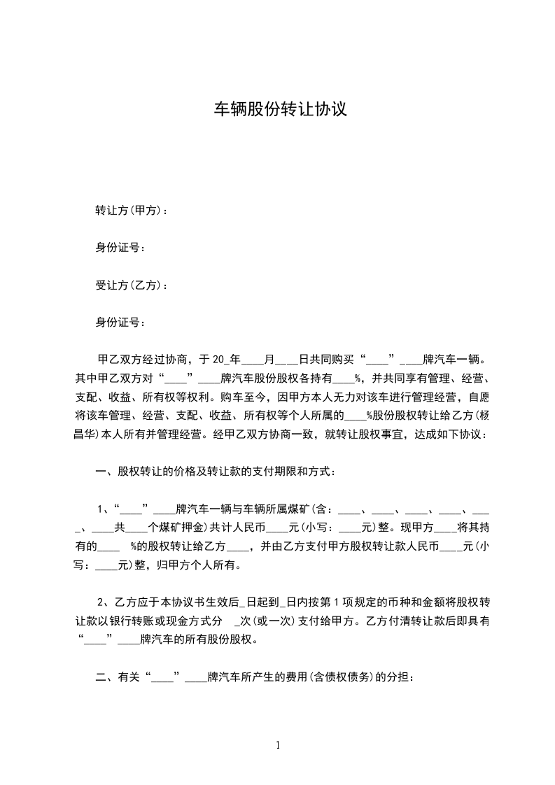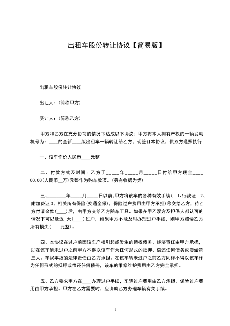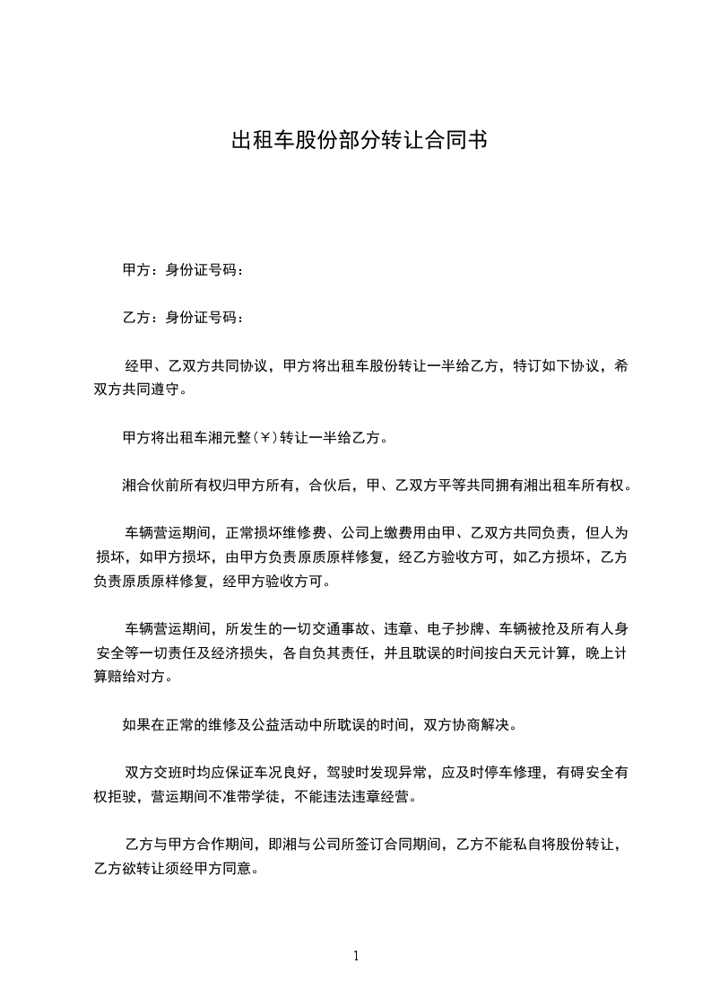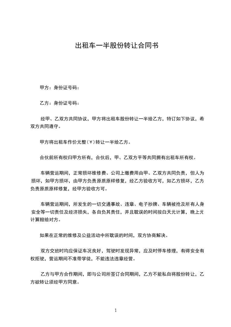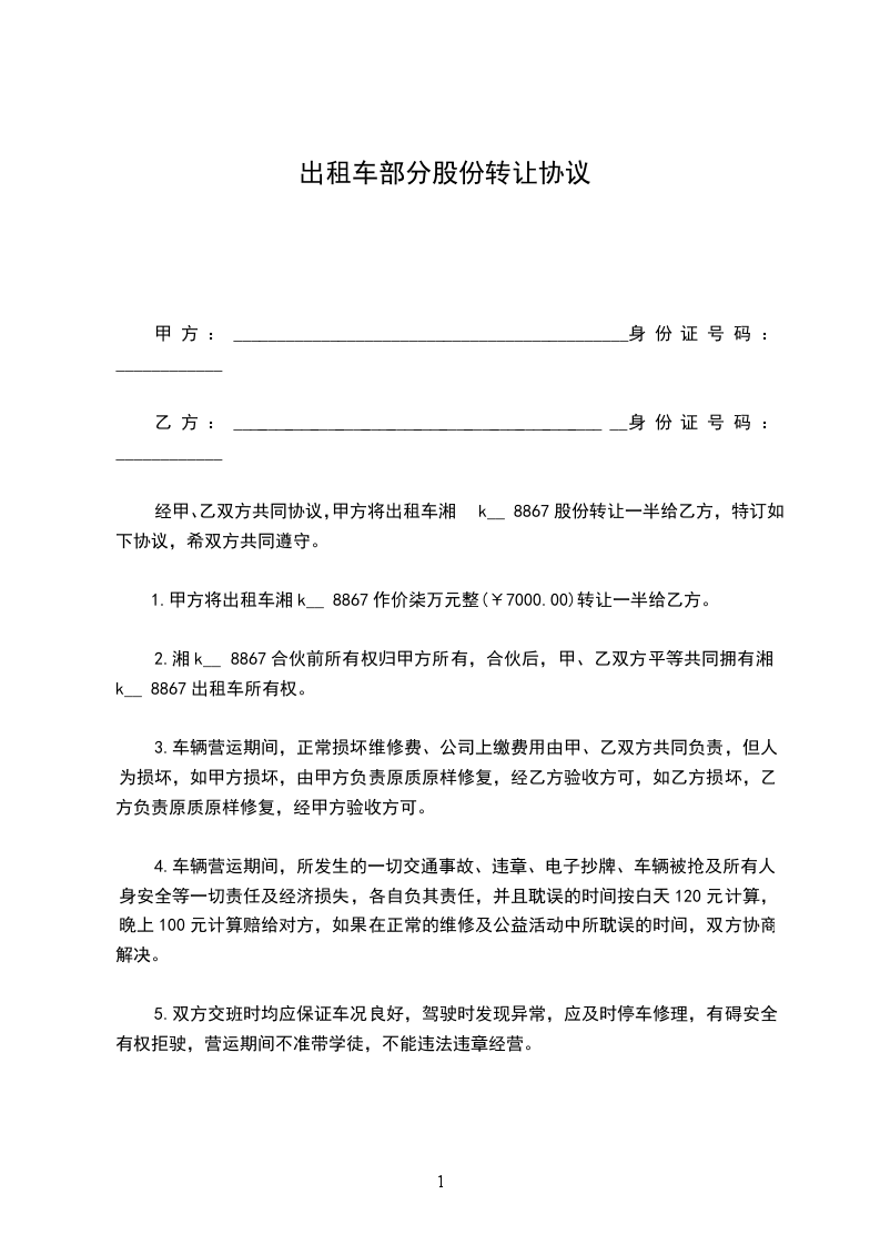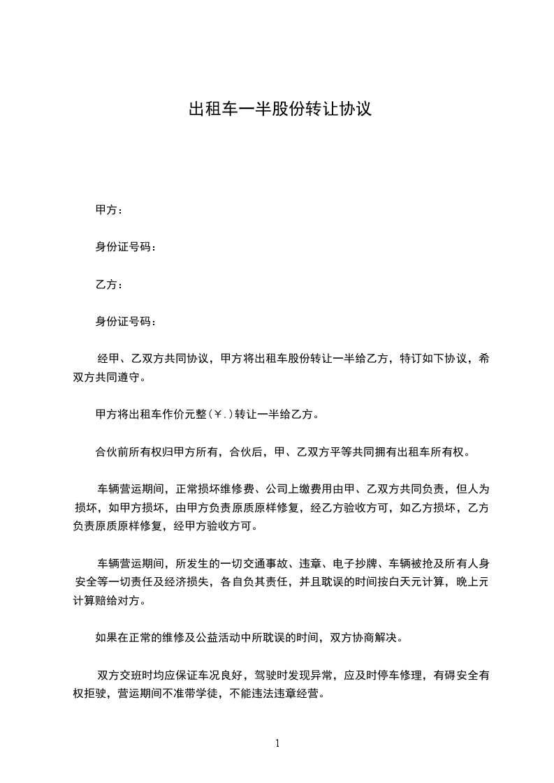 经甲、乙双方共同协议,甲方将出租车____________股份转让一半给乙方,特订如下协议,希双方共同遵守。