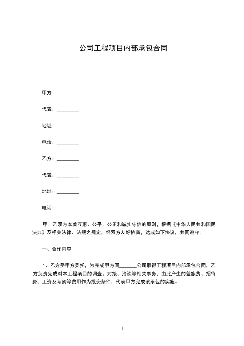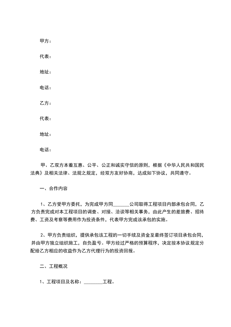 1、乙方受甲方委托,为完成甲方同_______公司取得工程项目内部承包合同,乙方负责完成对本工程项目的调查、对接、洽谈等相关事务,由此产生的差旅费、招待费、工资及考察等费用作为投资条件,代表甲方完成该承包的实施。