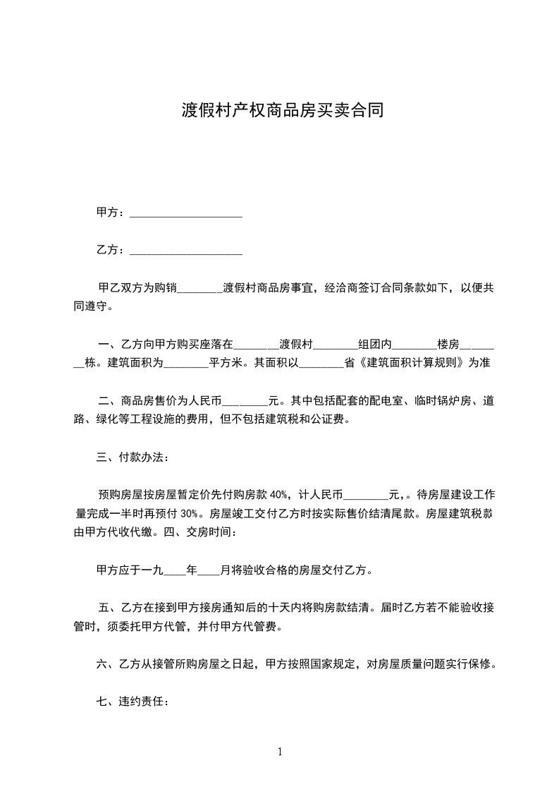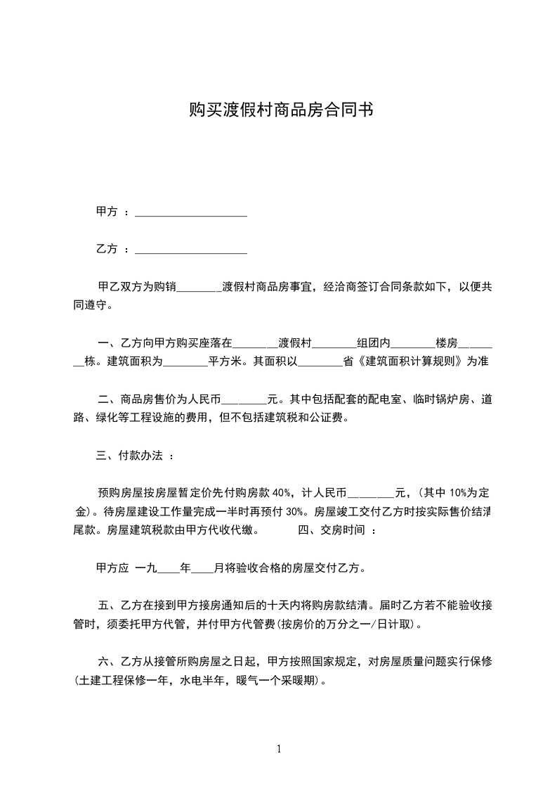 一、乙方向甲方购买座落在_________渡假村_________组团内_________楼房_________栋。建筑面积为_________平方米。其面积以_________省《建筑面积计算规则》为准。
