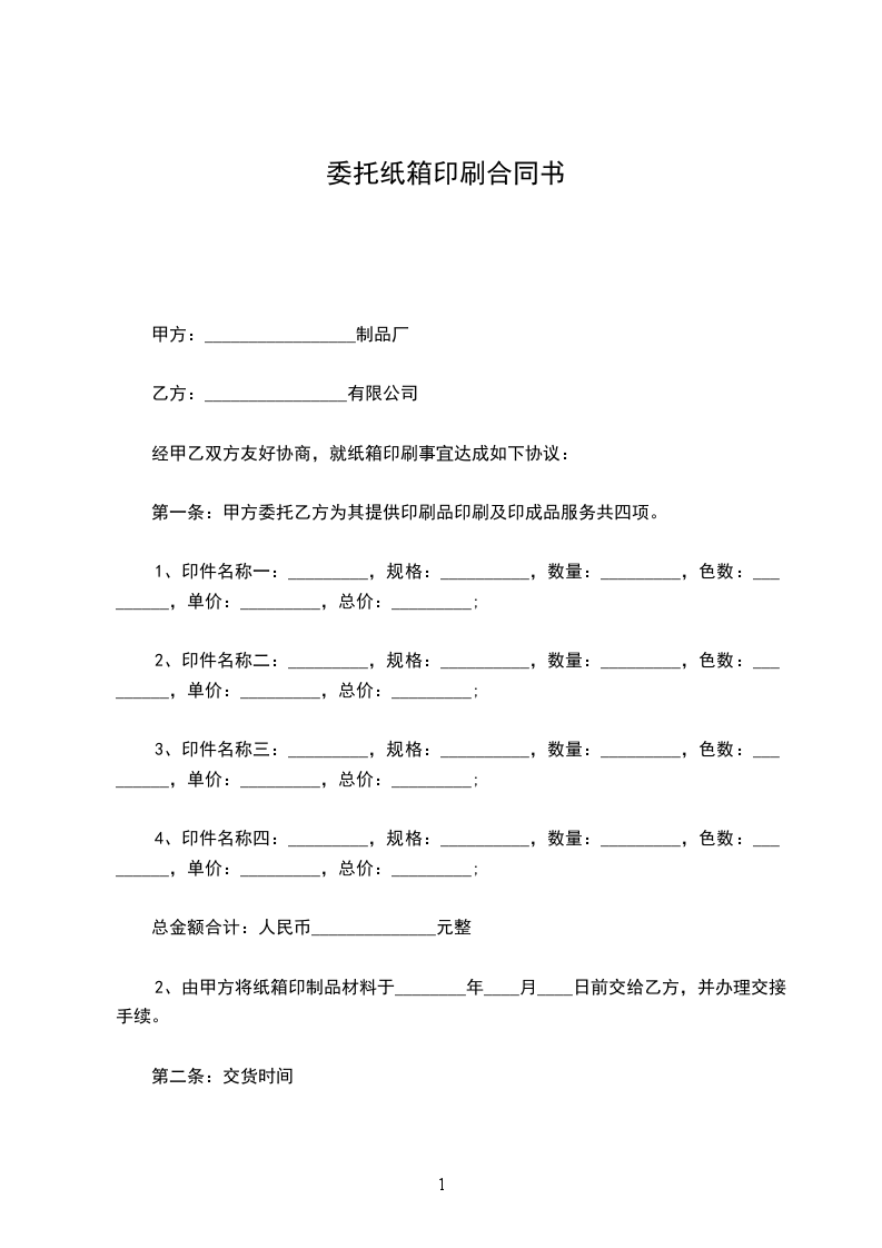 2、由甲方将纸箱印制品材料于________年____月____日前交给乙方,并办理交接手续。