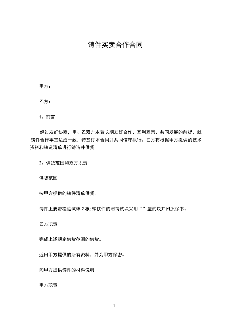 经过友好协商,甲、乙双方本着长期友好合作、互利互惠、共同发展的前提,就铸件合作事宜达成一致,特签订本合同并共同信守执行。乙方将根据甲方提供的技术资料和铸造清单进行铸造并供货。