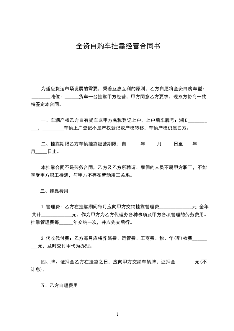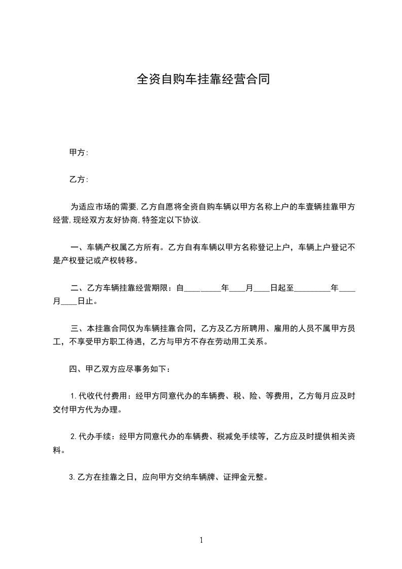 为适应市场的需要,乙方自愿将全资自购车辆以甲方名称上户的车壹辆挂靠甲方经营,现经双方友好协商,特签定以下协议.