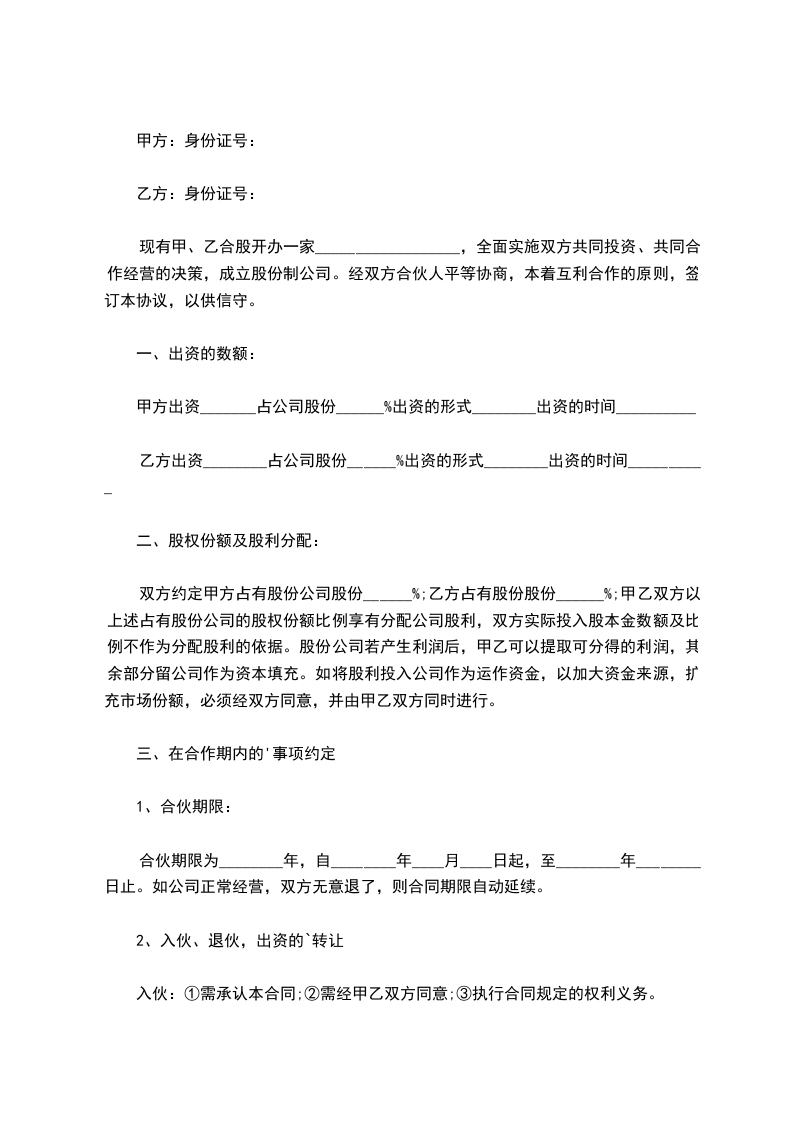 现有甲、乙合股开办一家__________________,全面实施双方共同投资、共同合作经营的决策,成立股份制公司。经双方合伙人平等协商,本着互利合作的原则,签订本协议,以供信守。