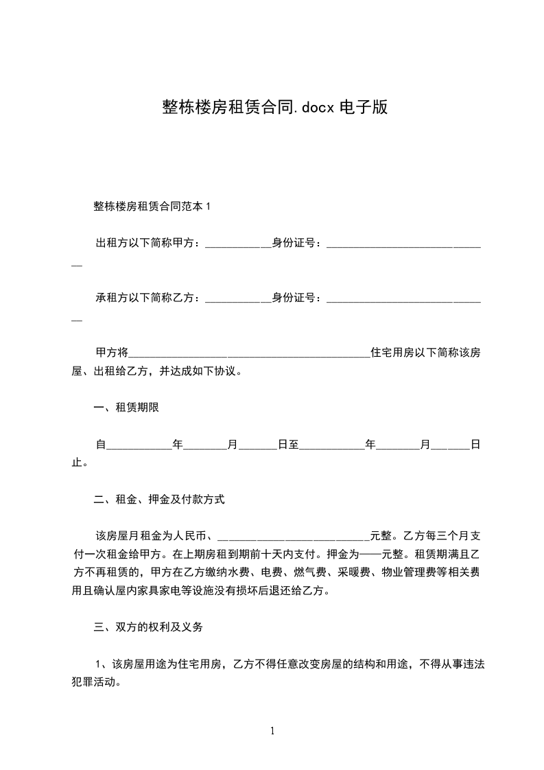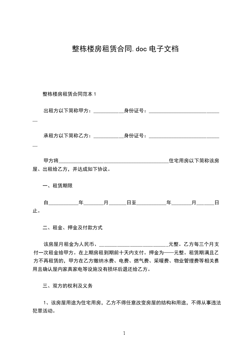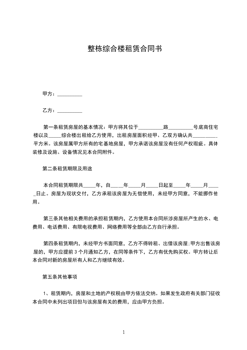 甲方将属于其位于__的整栋楼房出租给乙方使用,出租房屋面积经甲、乙双方确认共__平方米。
